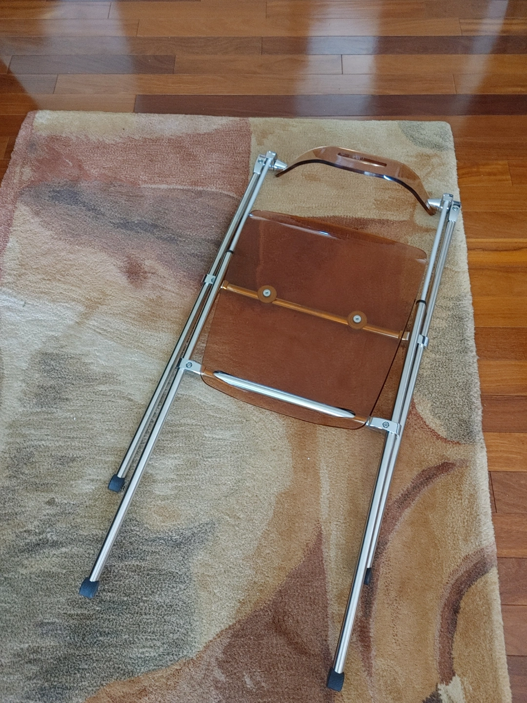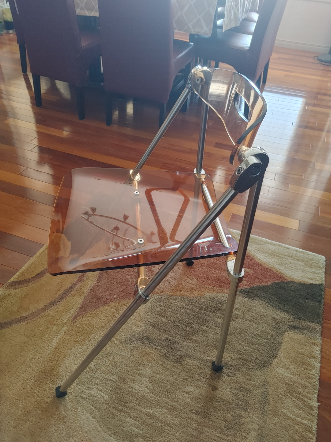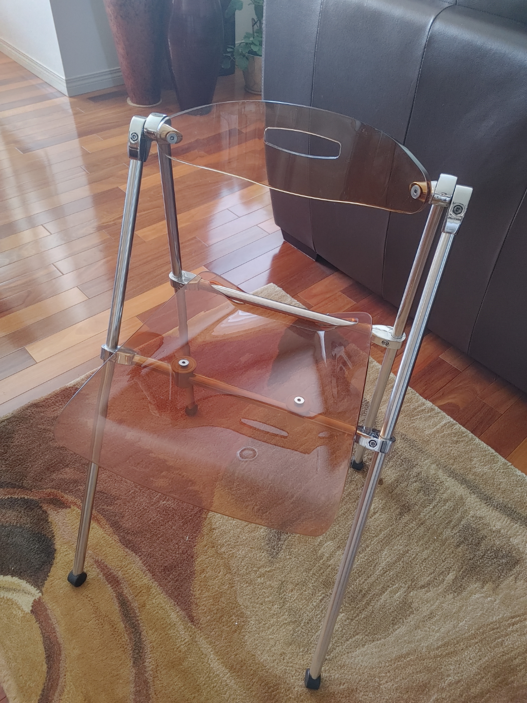 Stylish and elegant folding chair. Features amber acrylic seat and back. Chrome-plated steel legs. Lightweight and easy to store.Can be used inside or outside.