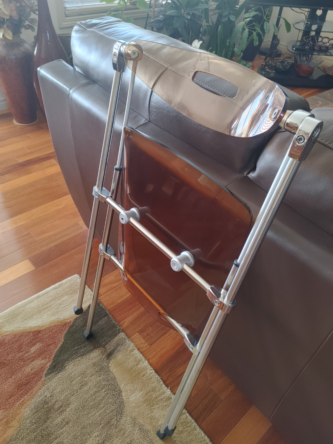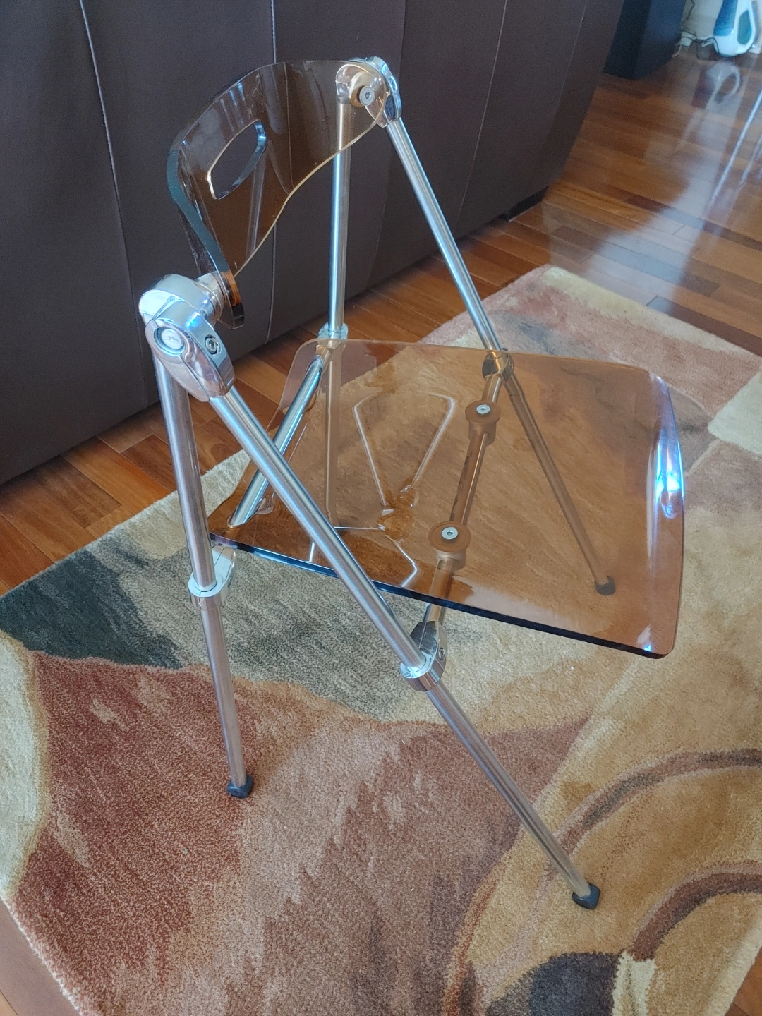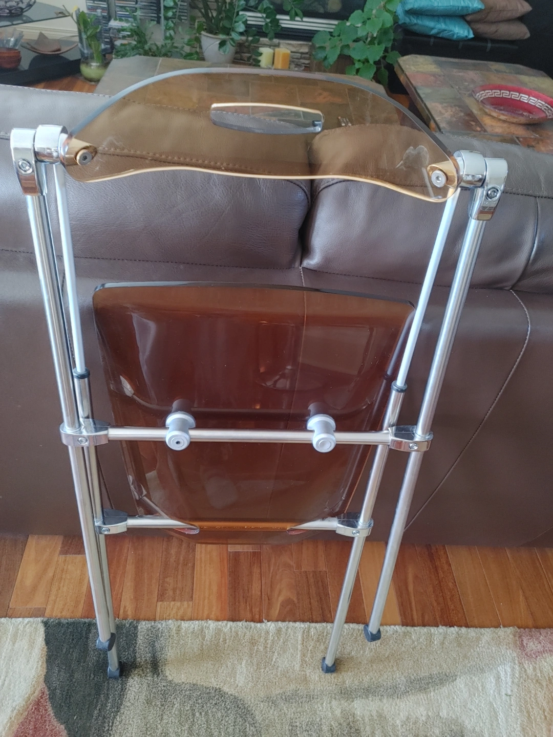 Stylish and elegant folding chair. Features amber acrylic seat and back. Chrome-plated steel legs. Lightweight and easy to store.Can be used inside or outside.