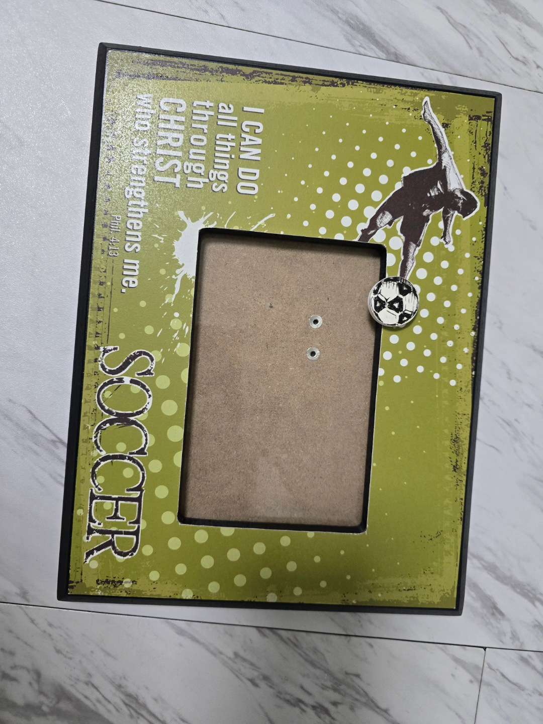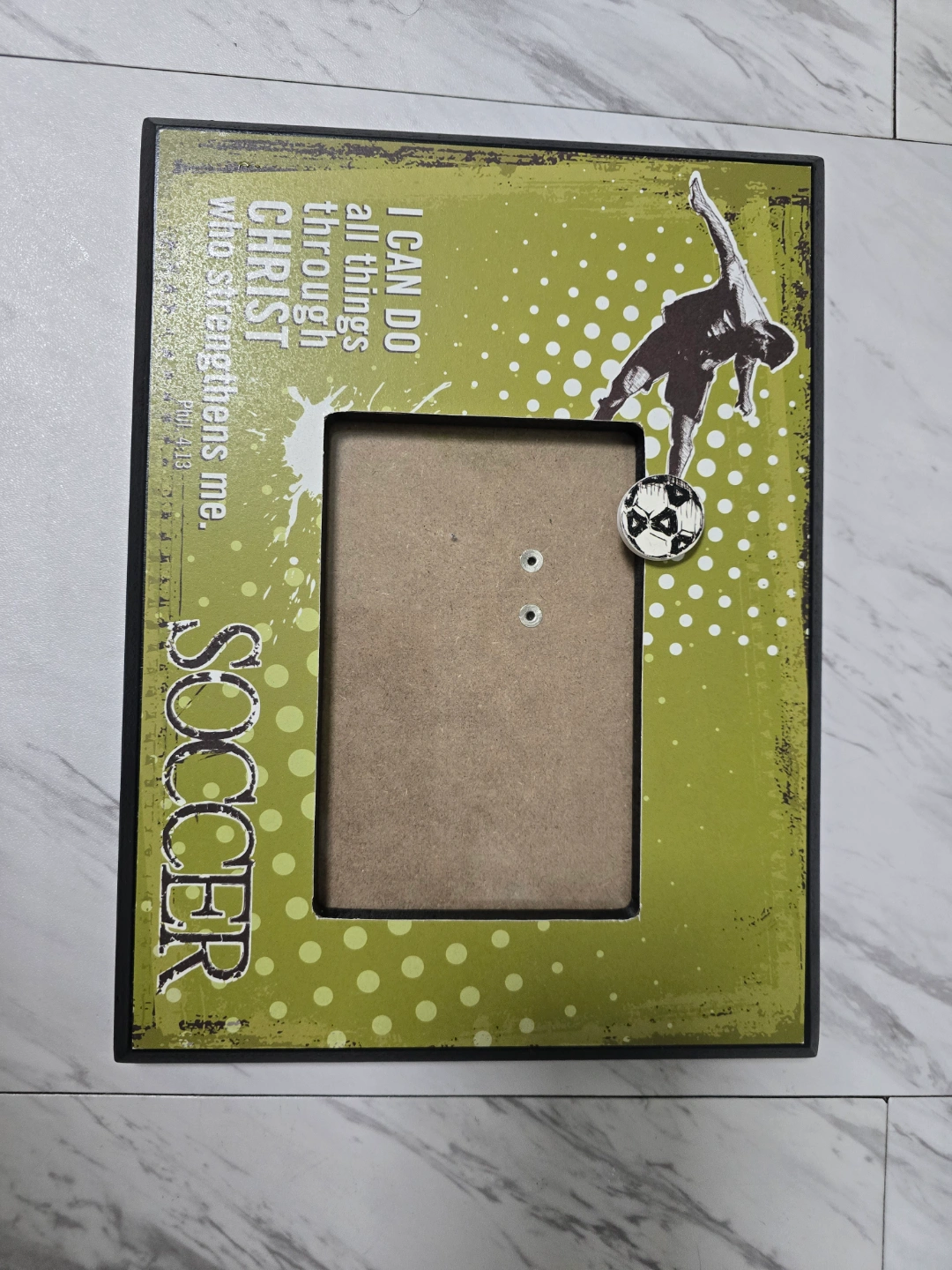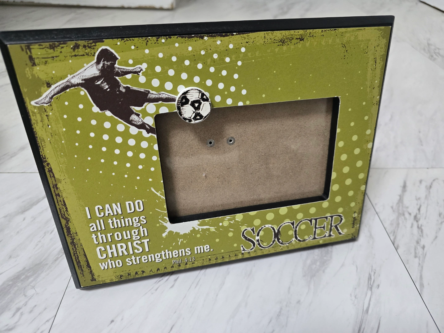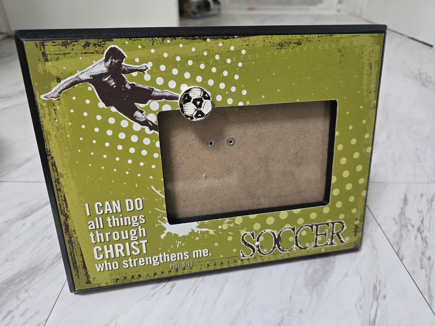 Wood picture frame. Olive green background. Soccer player graphic. Inspirational verse. Small soccer ball accent. Ready for your favorite photo.