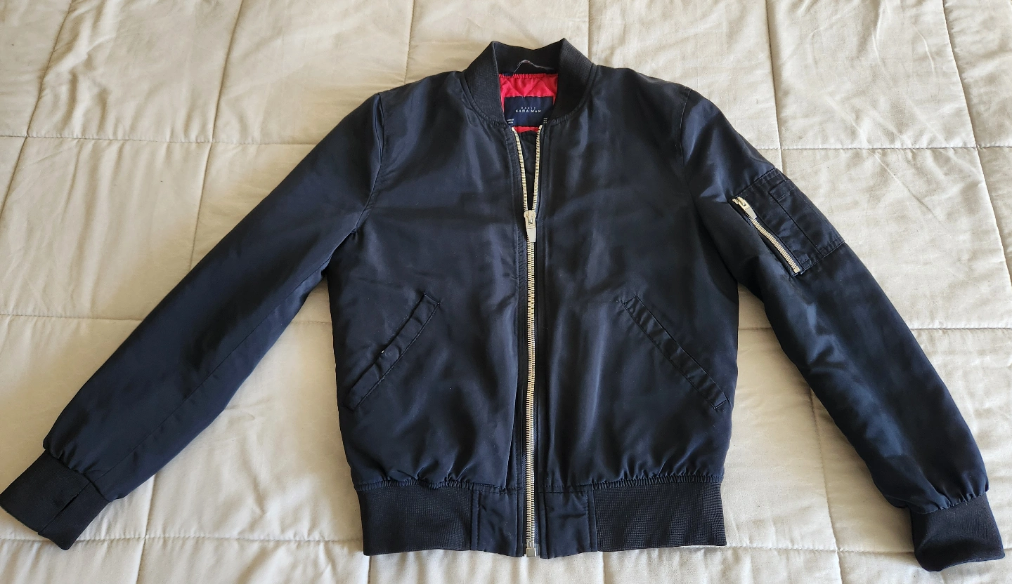 Men's black bomber jacket. Size small. Features a red quilted lining and silver zippers. Excellent condition.