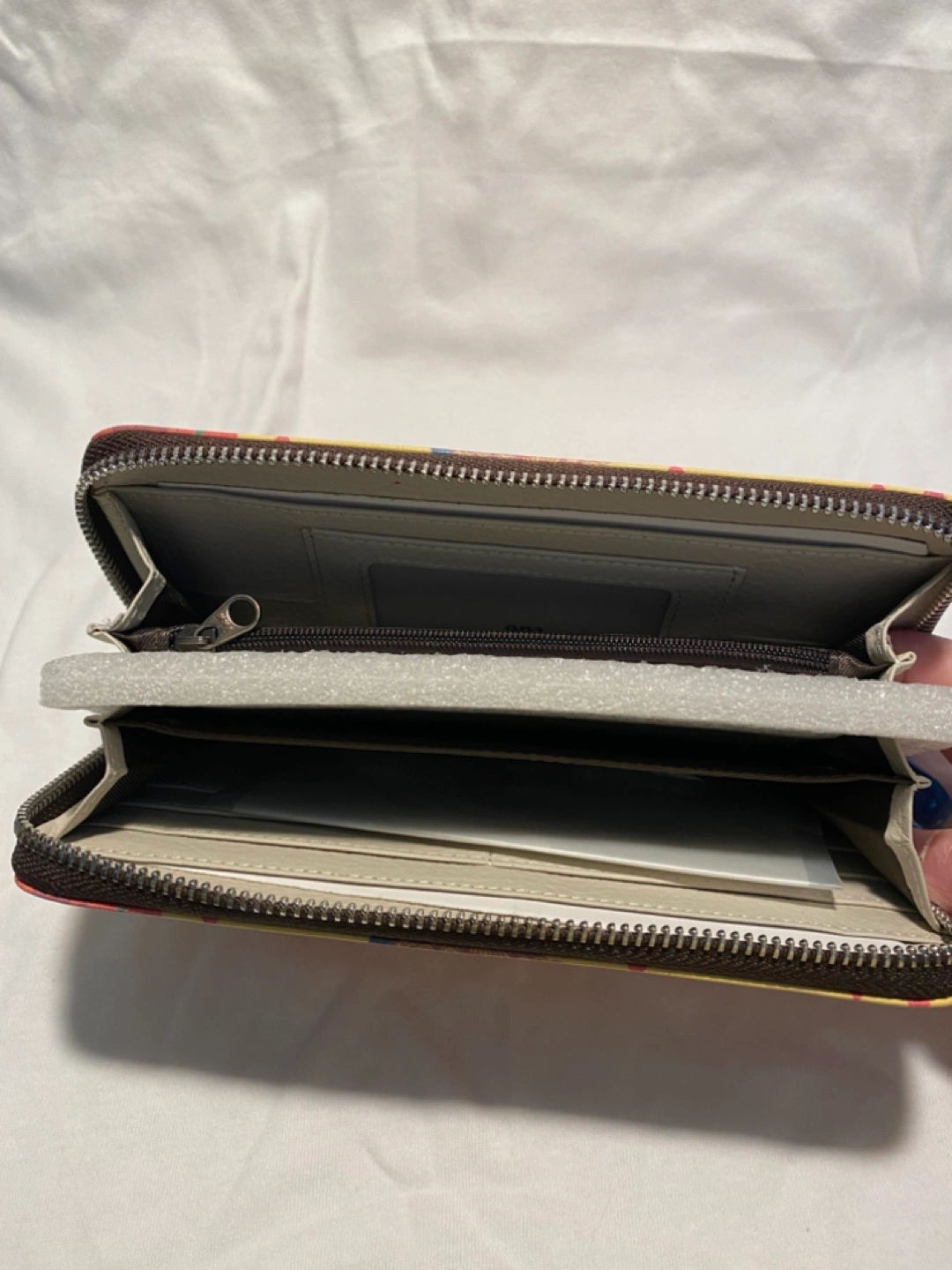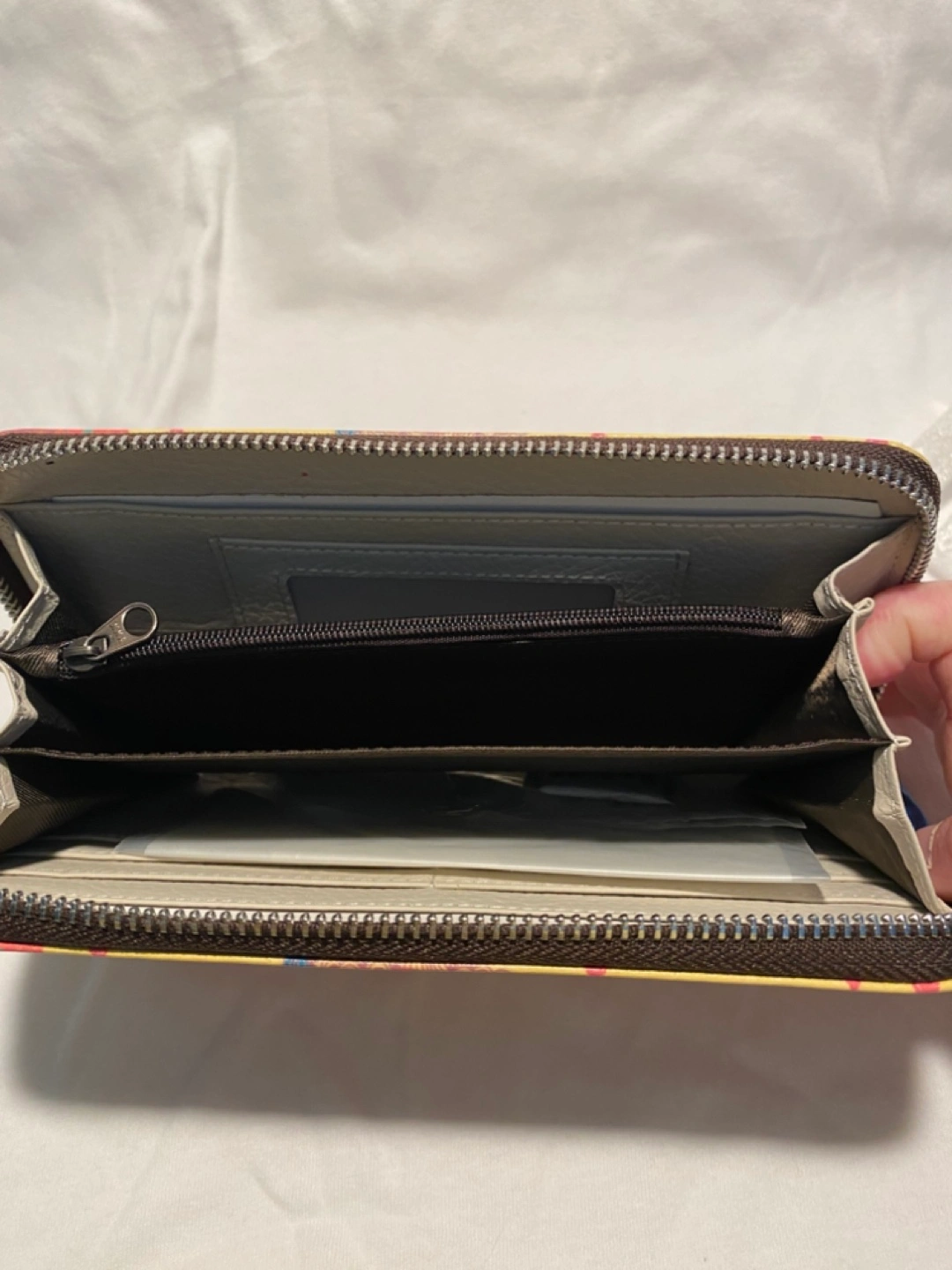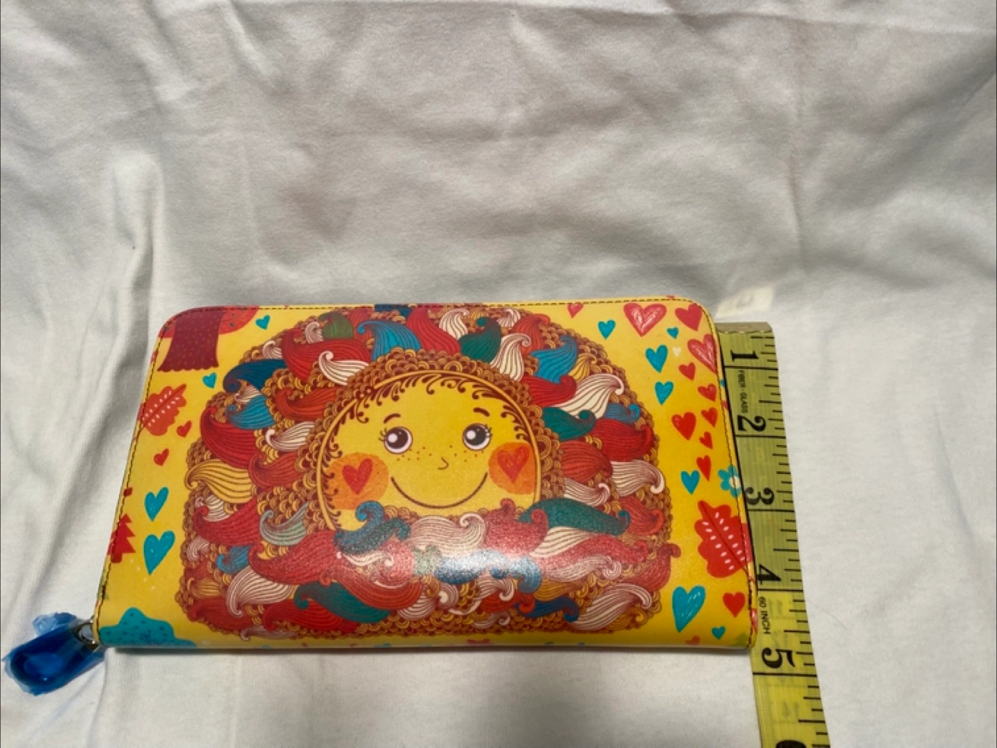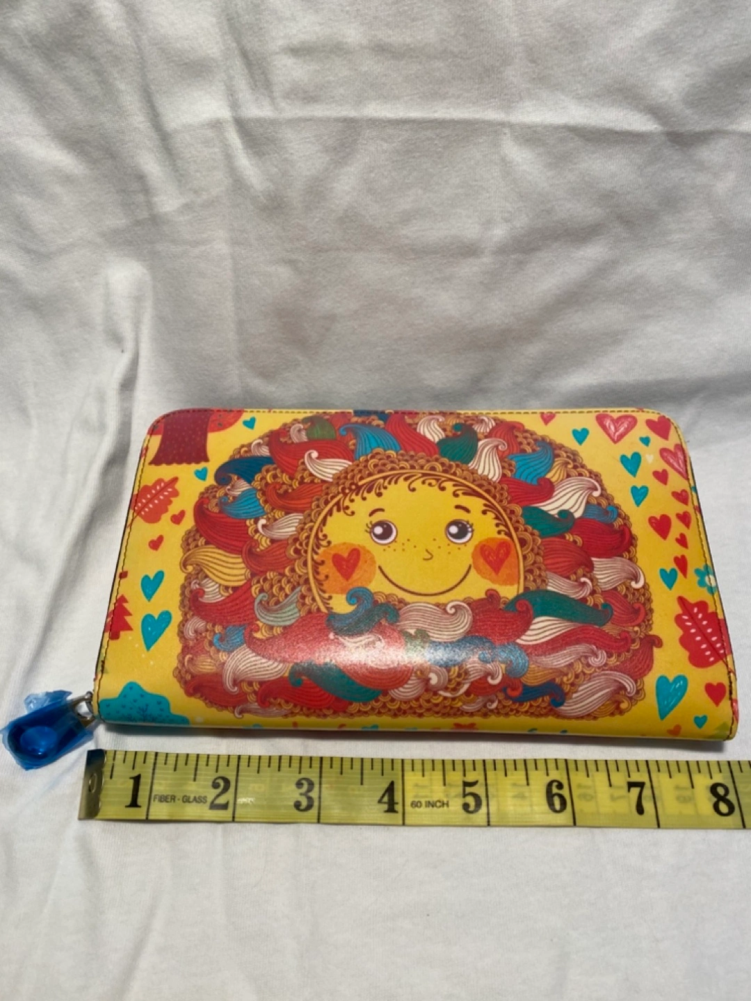 Women's zip-around wallet. Features a cheerful sun design. Multiple card slots and compartments. Approx. 7 inches long.