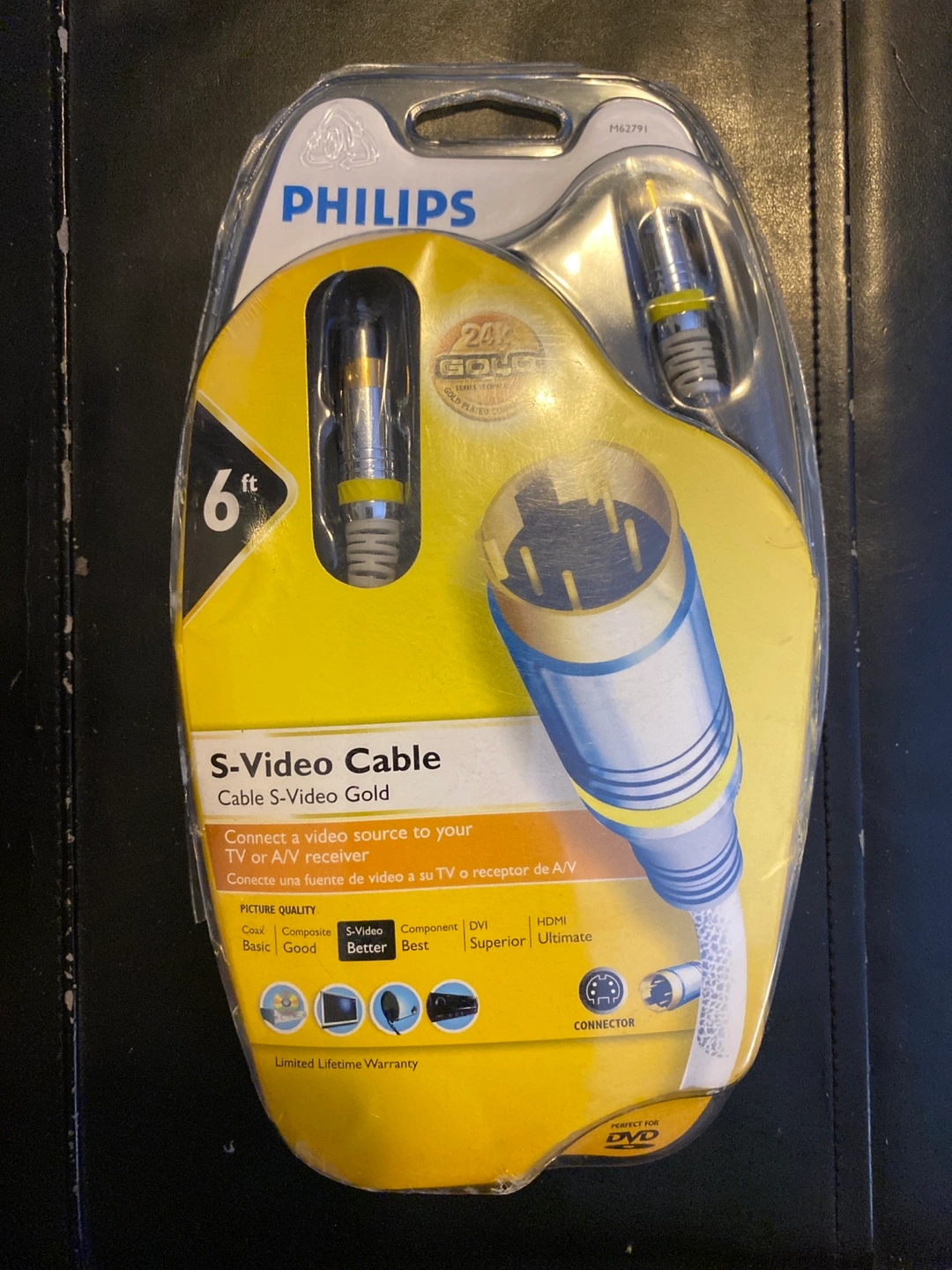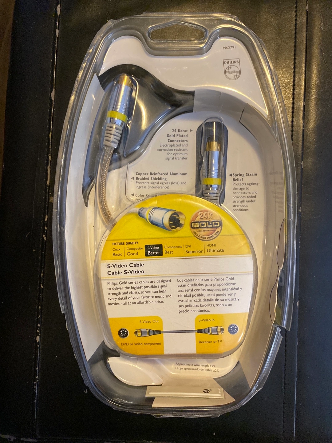 New, 6ft Philips S-Video Gold cable. Connects video source to TV or A/V receiver. Features 24K gold connectors, braided shielding, and copper reinforced aluminum. Limited lifetime warranty.