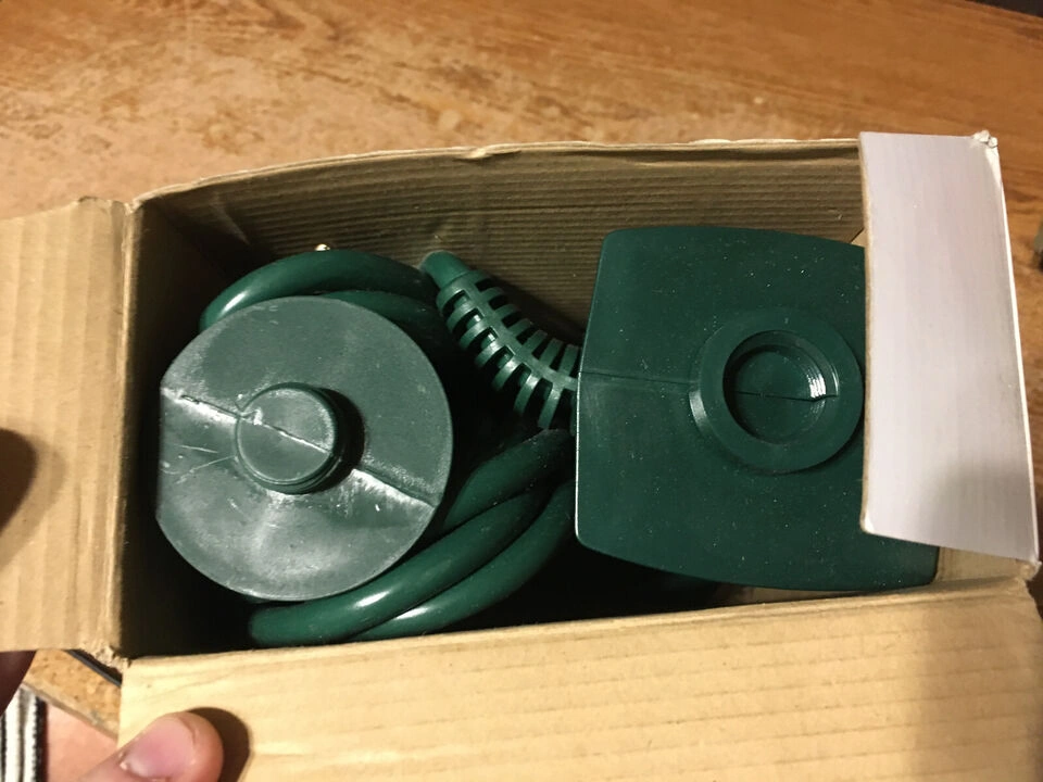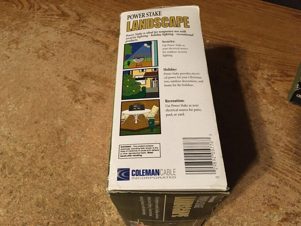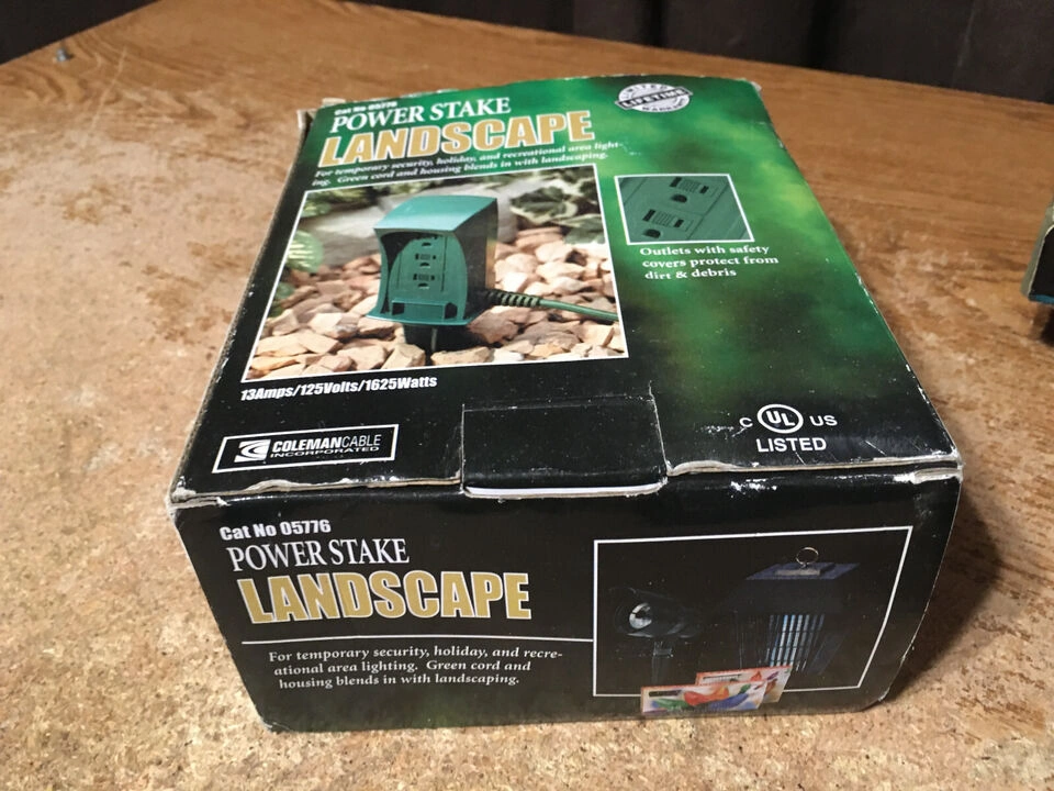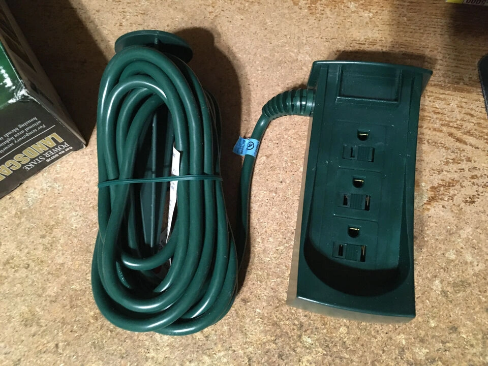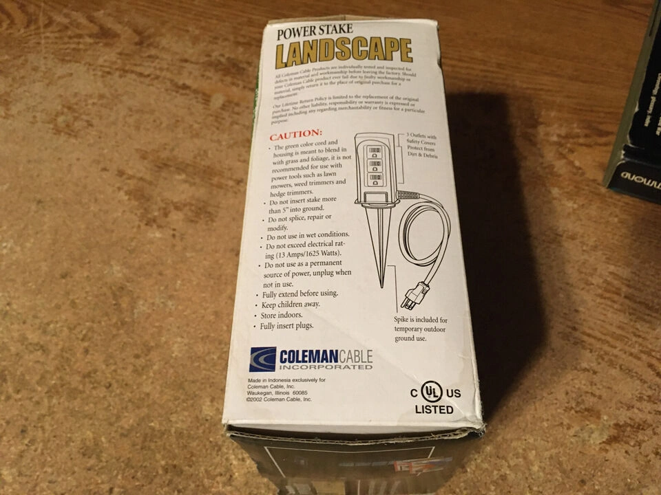 New in box, never used. Green power stake with three outlets. Safe for temporary outdoor ground use. 13 Amps/125 Volts/1625 Watts. pick up at house