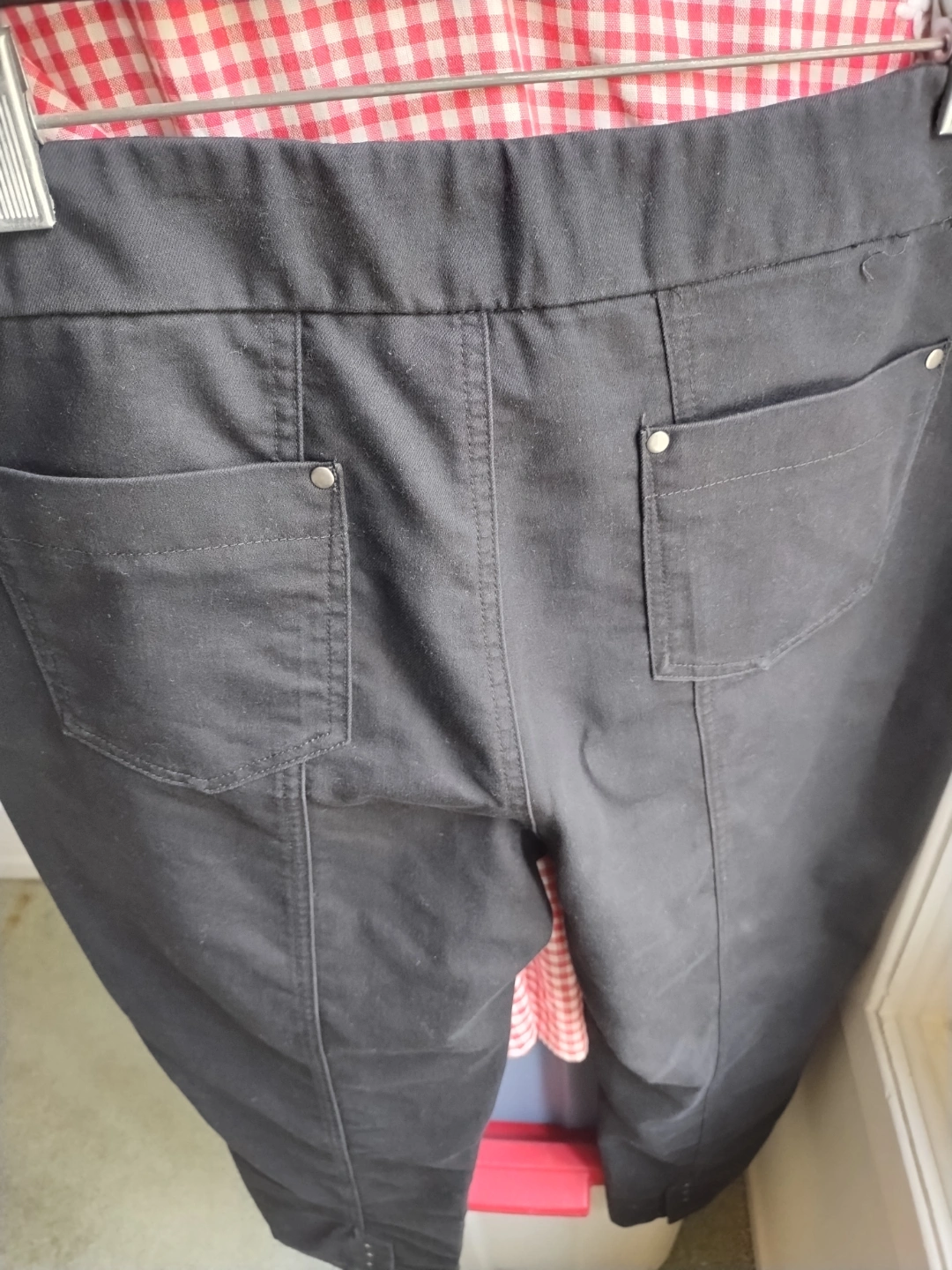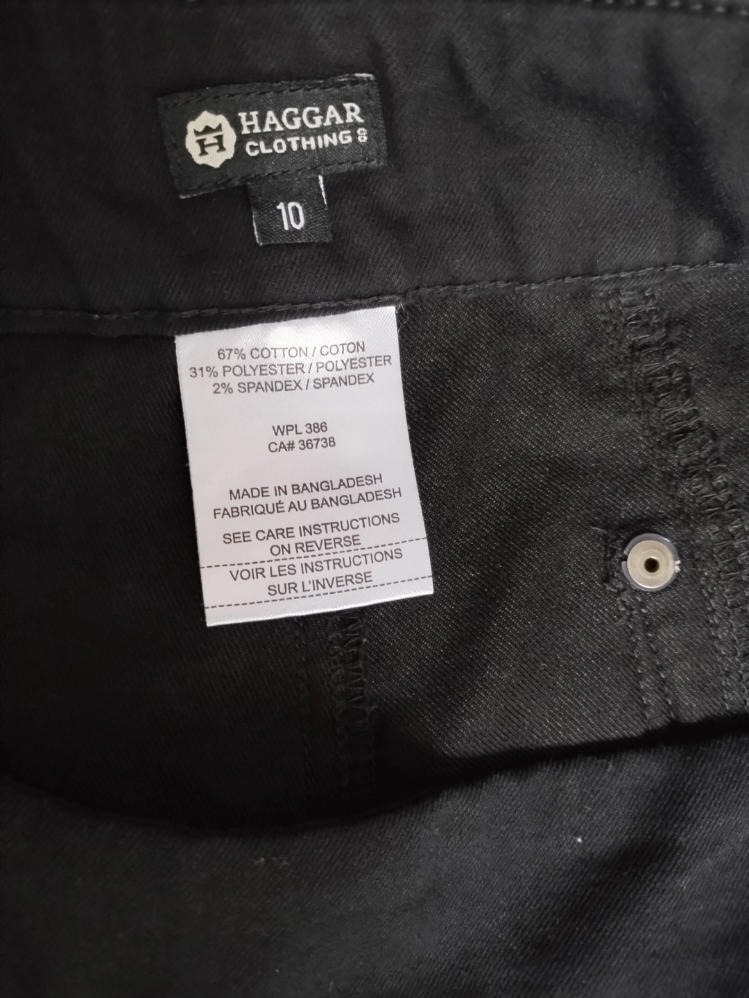 Women's size 10 black pull-on ankle pants. 67% cotton, 31% polyester, 2% spandex. Made in Bangladesh. Features a comfortable pull-on design and pockets. Easy care material.