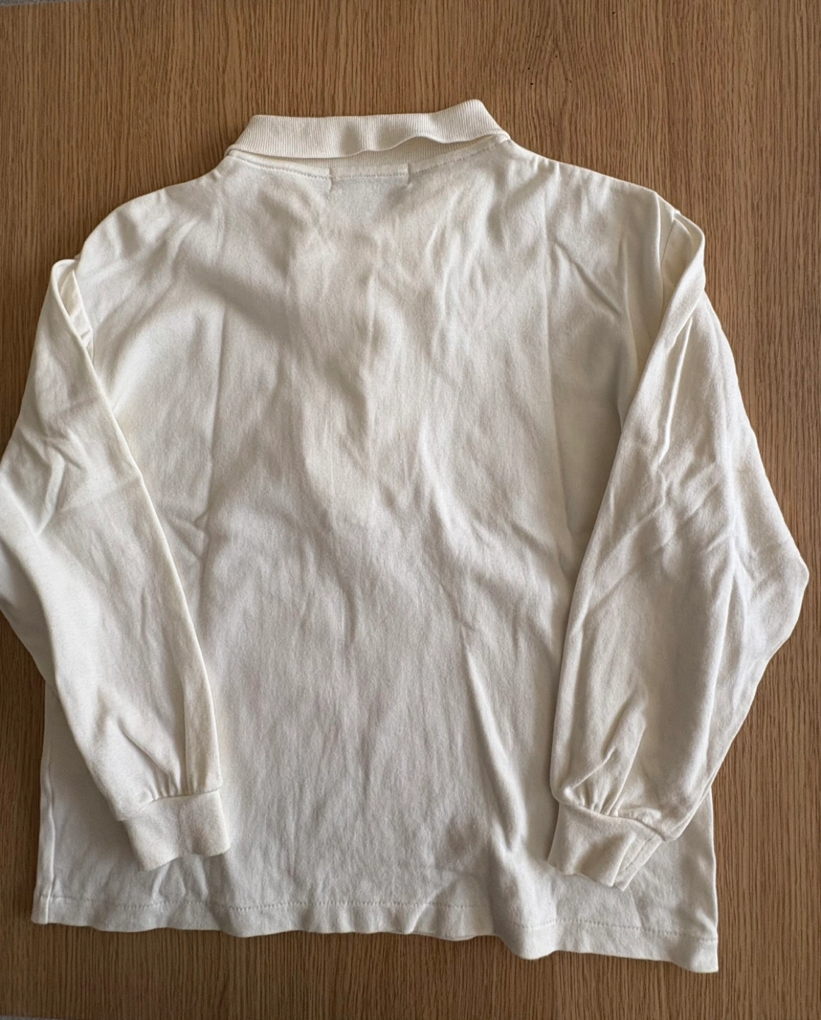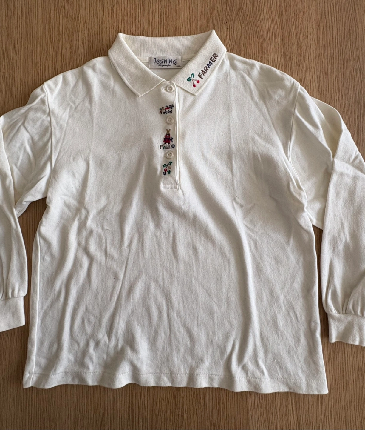 Cream-coloured long sleeve polo shirt. Features embroidered details on the placket. Relaxed fit. Excellent condition.