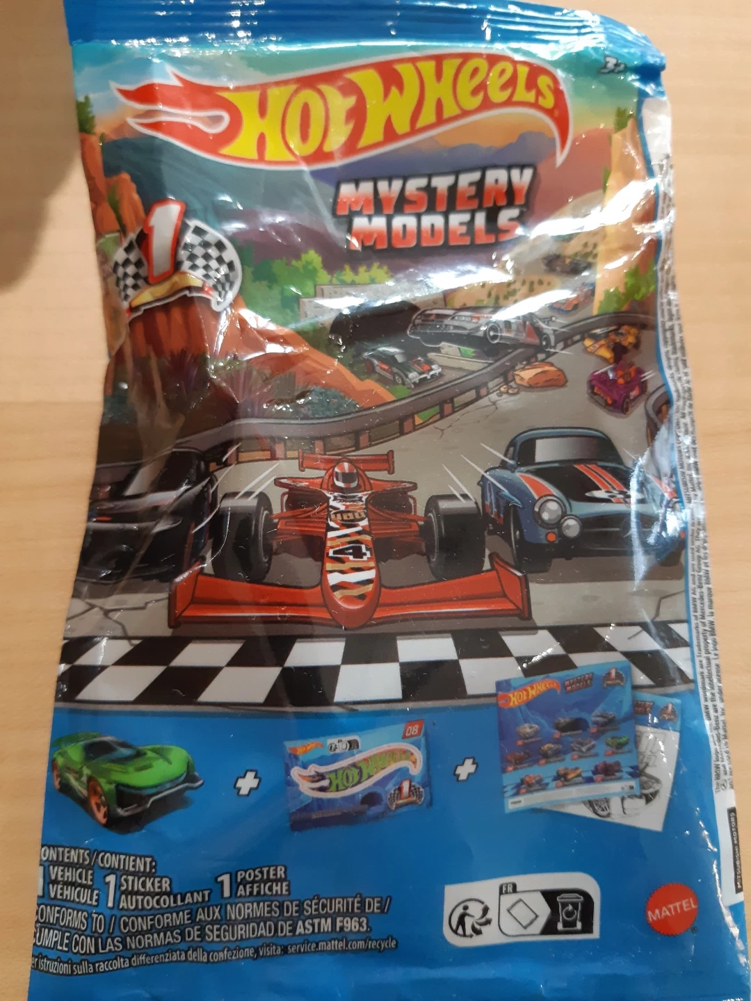 New Hot Wheels Mystery Models blind bag. Includes one vehicle, one sticker, and one poster. Collect them all!