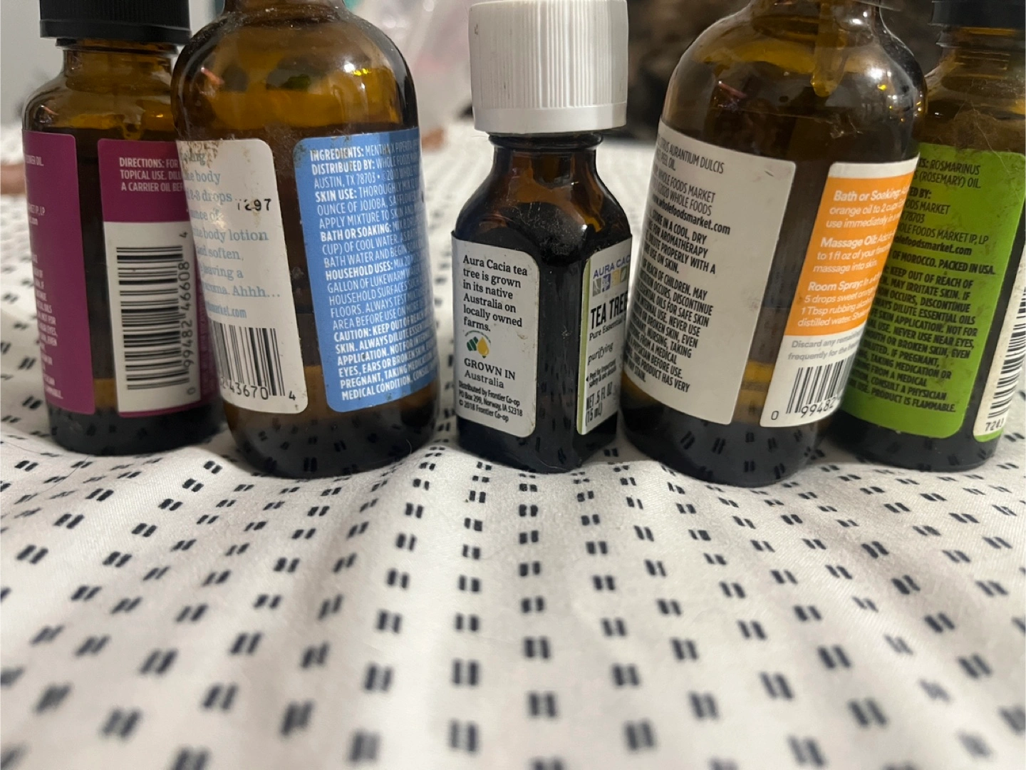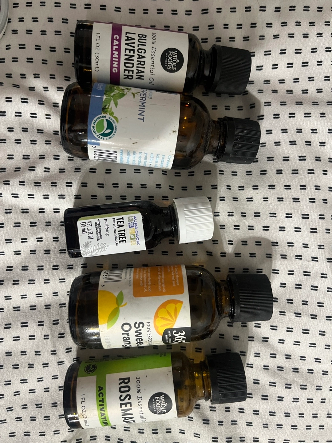 Collection of six different essential oil bottles. Includes lavender, peppermint, tea tree, sweet orange, rosemary, and Aura Cacia tea tree. Various brands included. Small bottles, 1 fl oz each.