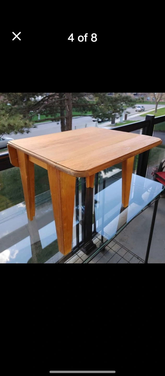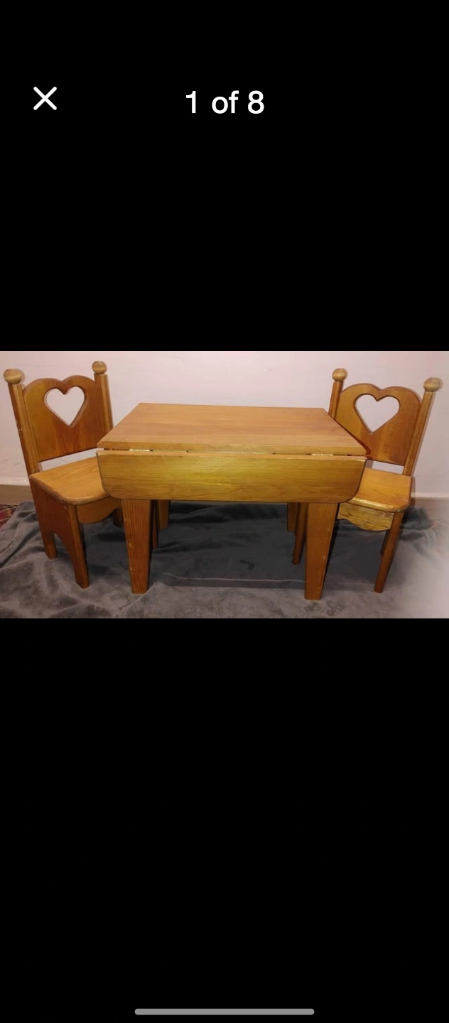 Adorable vintage children's DOLL table and two chairs. Heart-shaped cutouts in chair backs. Table folds for easy storage. Solid wood construction. Perfect for playtime or a child's room.