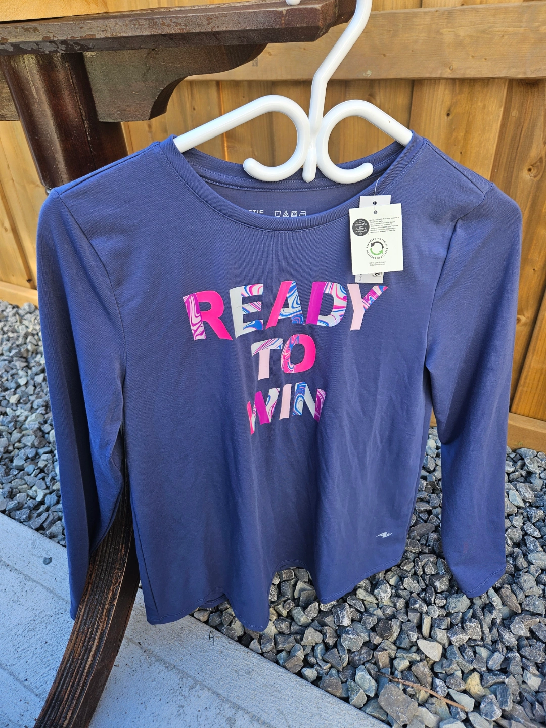 Girls' long-sleeve shirt. Size XL (14-16). Purple colour. Features a 'Ready to Win' graphic. Made with recycled polyester. New with tags.