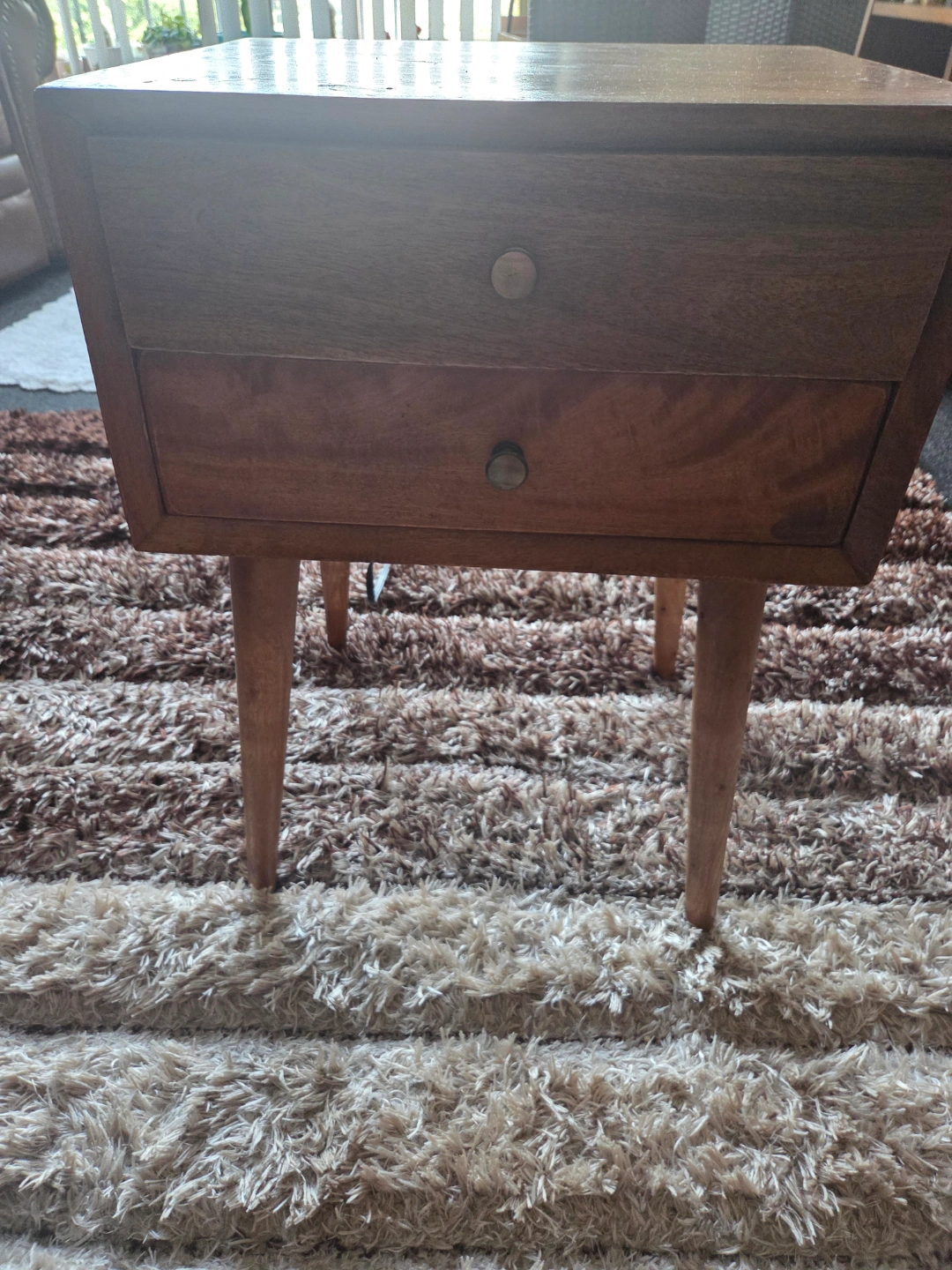 Two-drawer nightstand. Solid wood construction. Tapered legs. Minimalist design. Perfect for bedroom or living room. The pair.