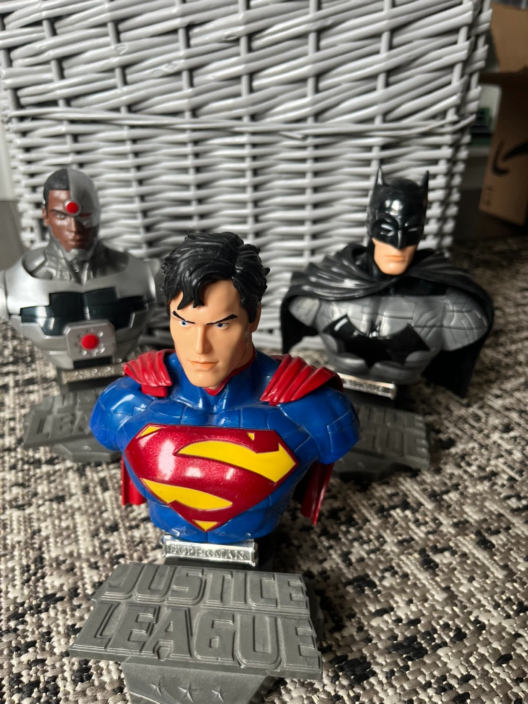 Collectible Justice League busts. Features Superman, Batman, and Cyborg. Approximately 20 cm tall. Great for collectors or fans.