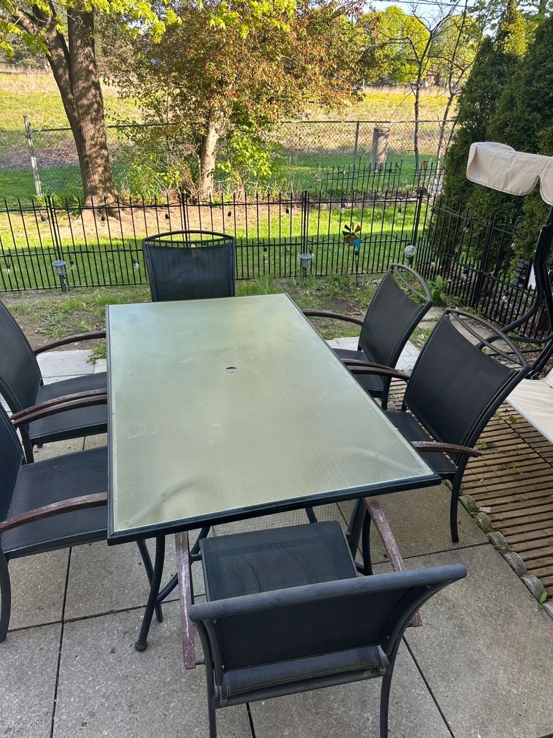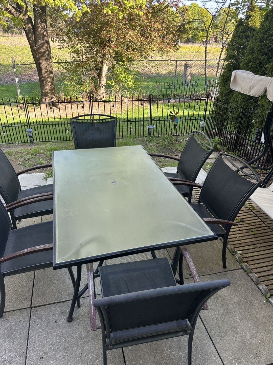 Black metal frame patio dining set. Glass tabletop. Six chairs with mesh seats and dark brown armrests. Suitable for outdoor use.