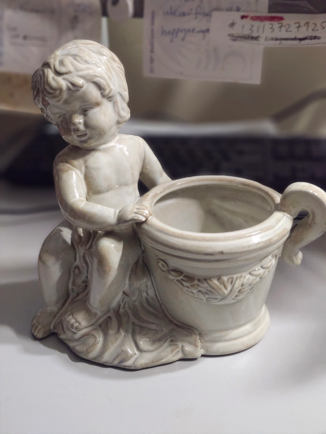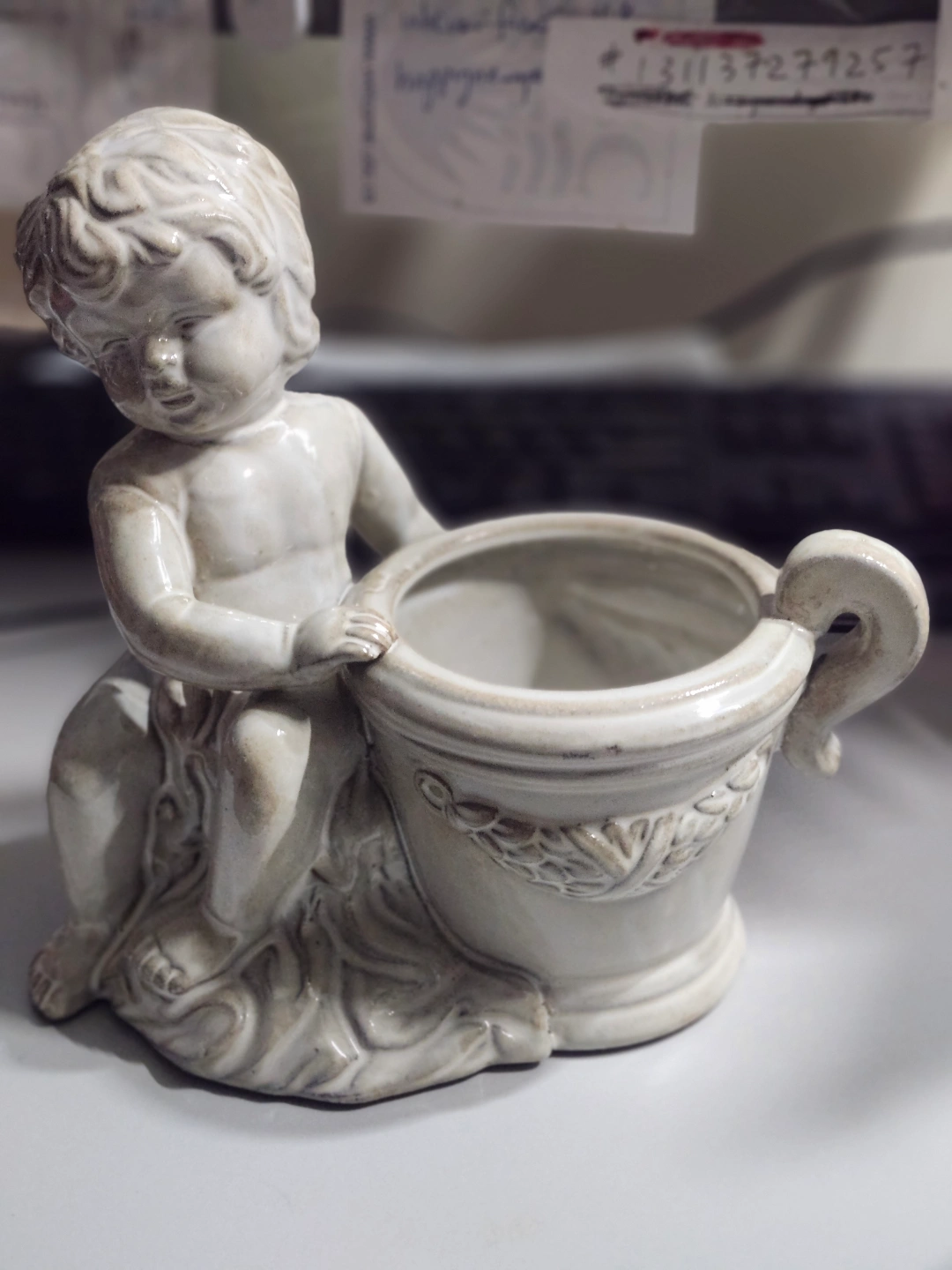 Ornate cherub figurine planter. Off-white ceramic. Small size. Perfect for a small succulent or decorative item.