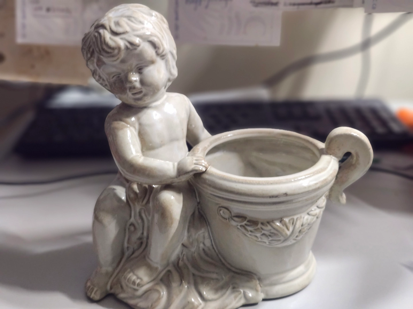 Ornate cherub figurine planter. Off-white ceramic. Small size. Perfect for a small succulent or decorative item.