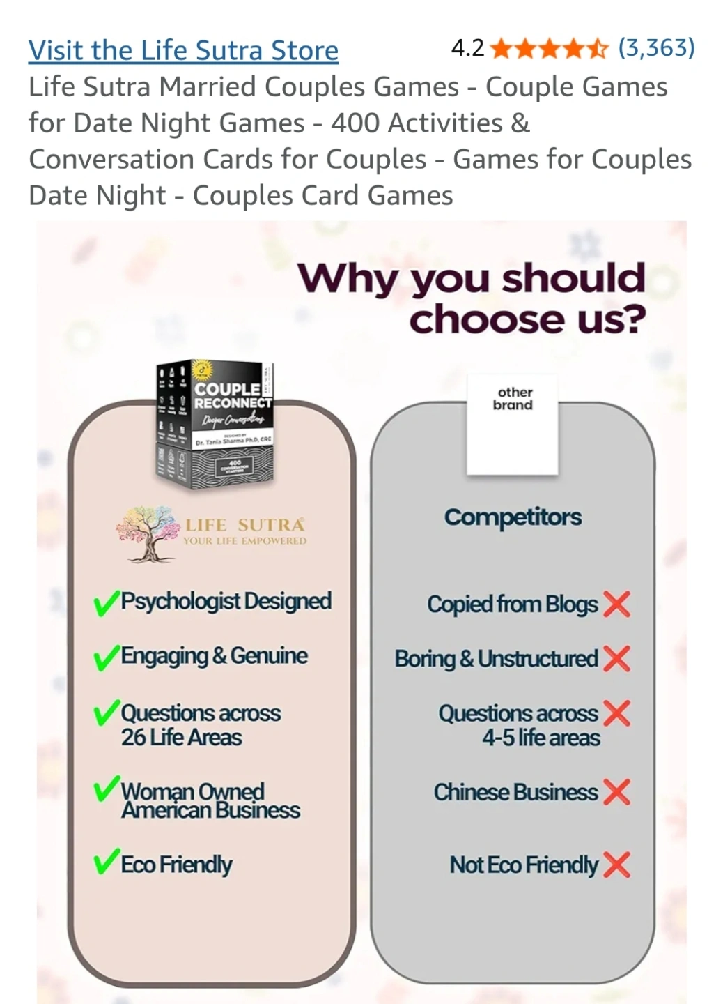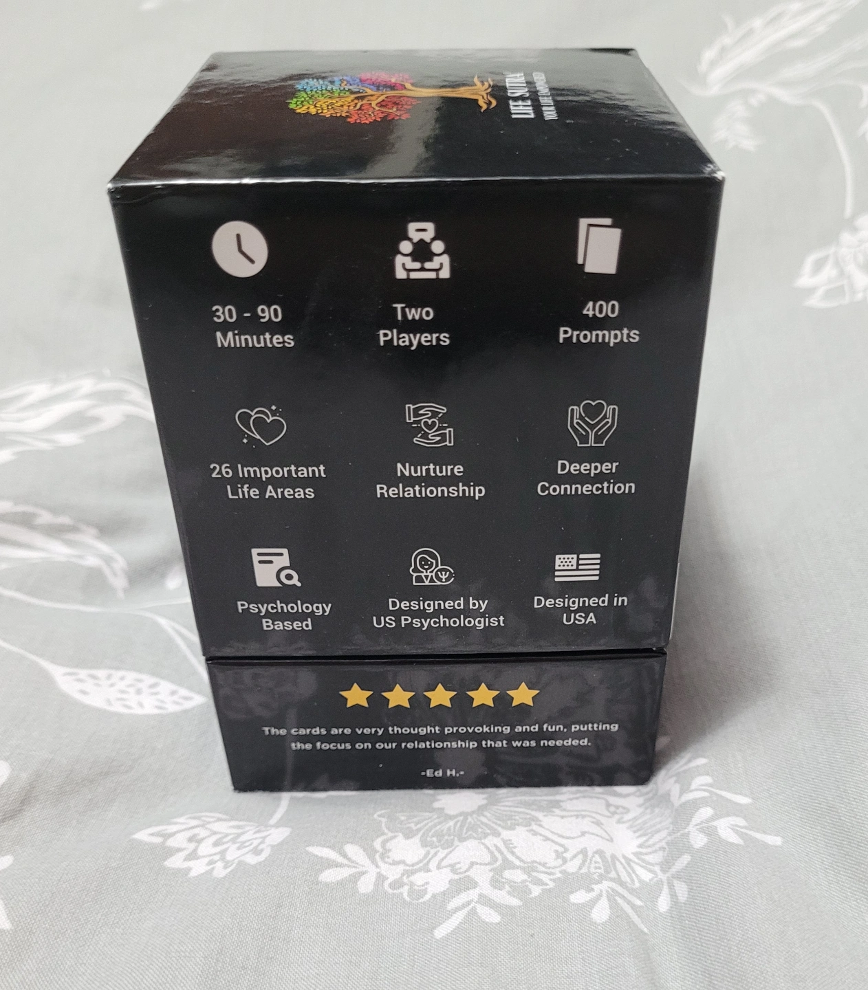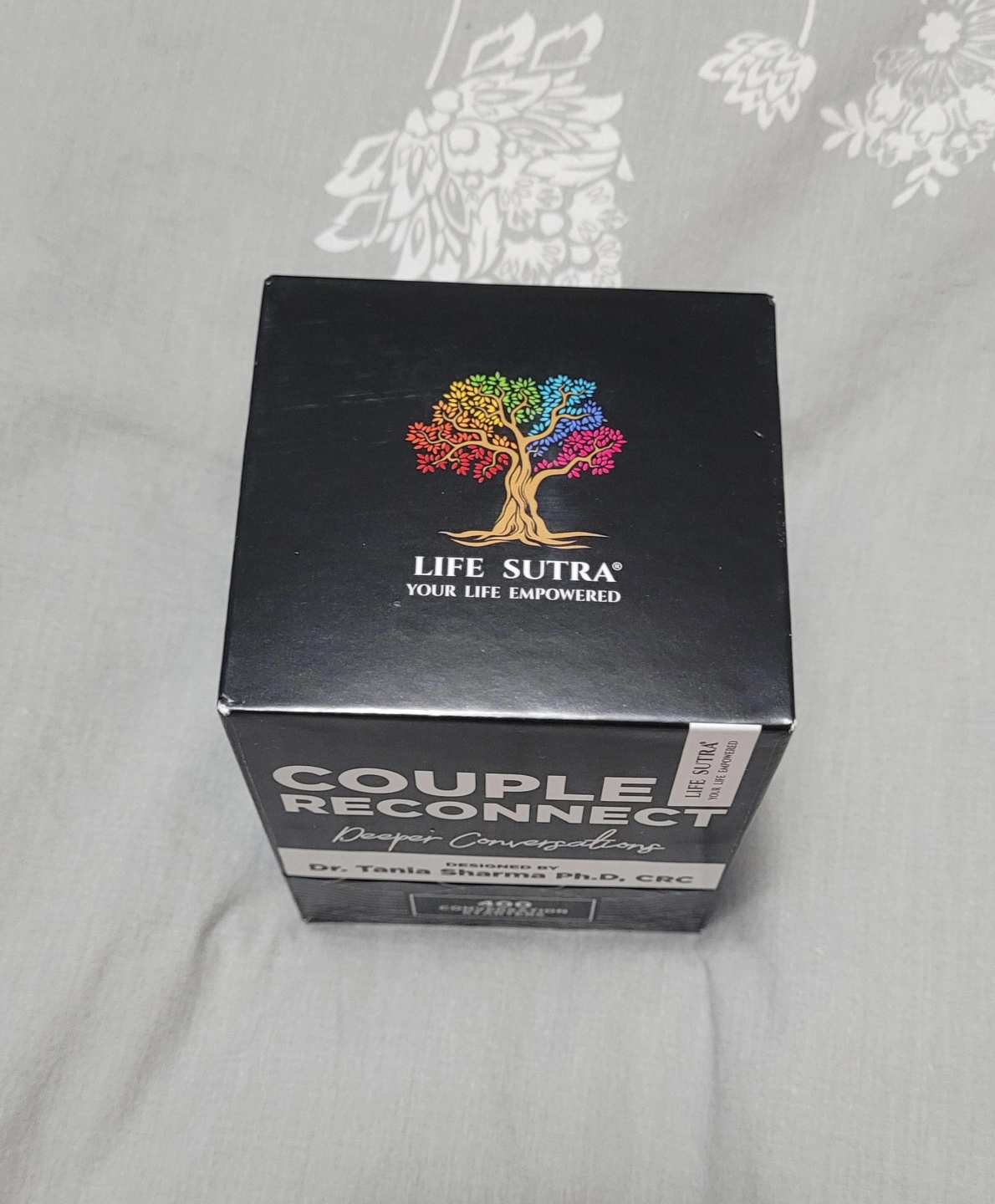 Couple's card game. 400 conversation starters. 26 key life areas. Designed by Dr. Tania Sharma PhD, CRC. Promotes deeper conversations and connection. Great for date night. New, Never used.