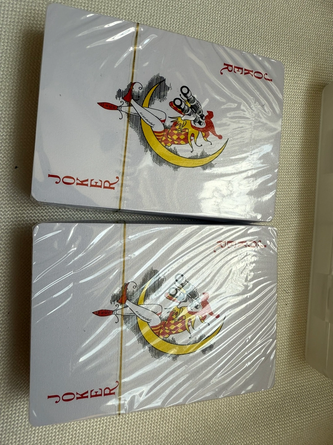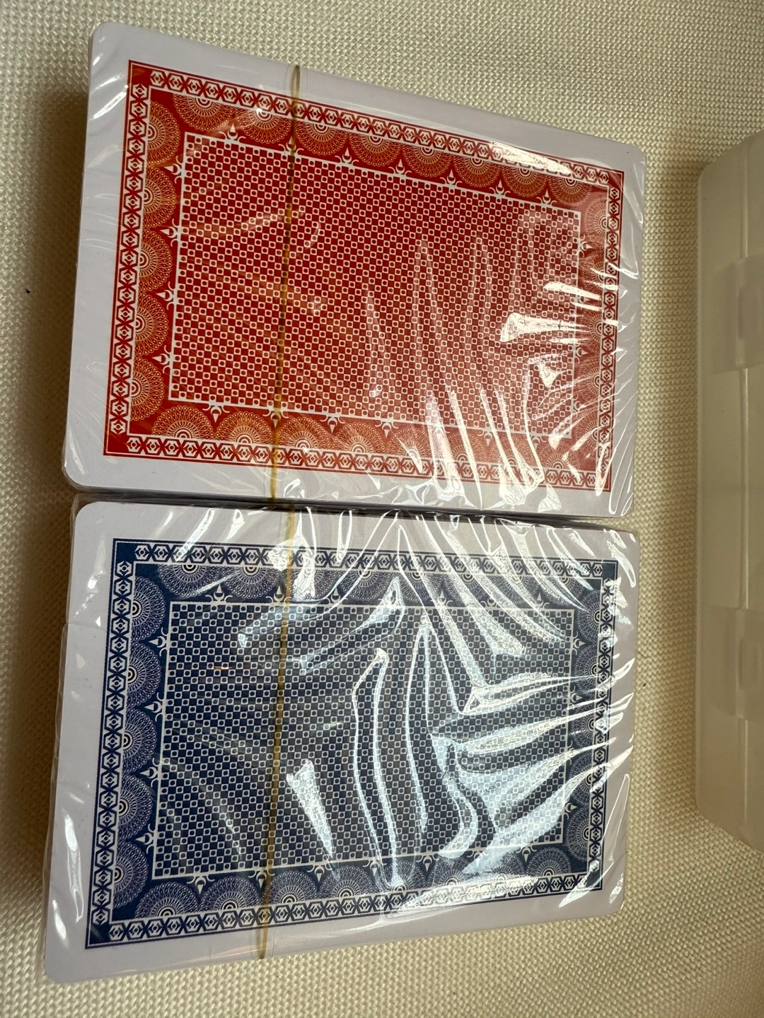 Two decks of Stellar Hero 100% plastic playing cards. Premium quality, washable, and durable. Includes a plastic storage case. Standard poker size.