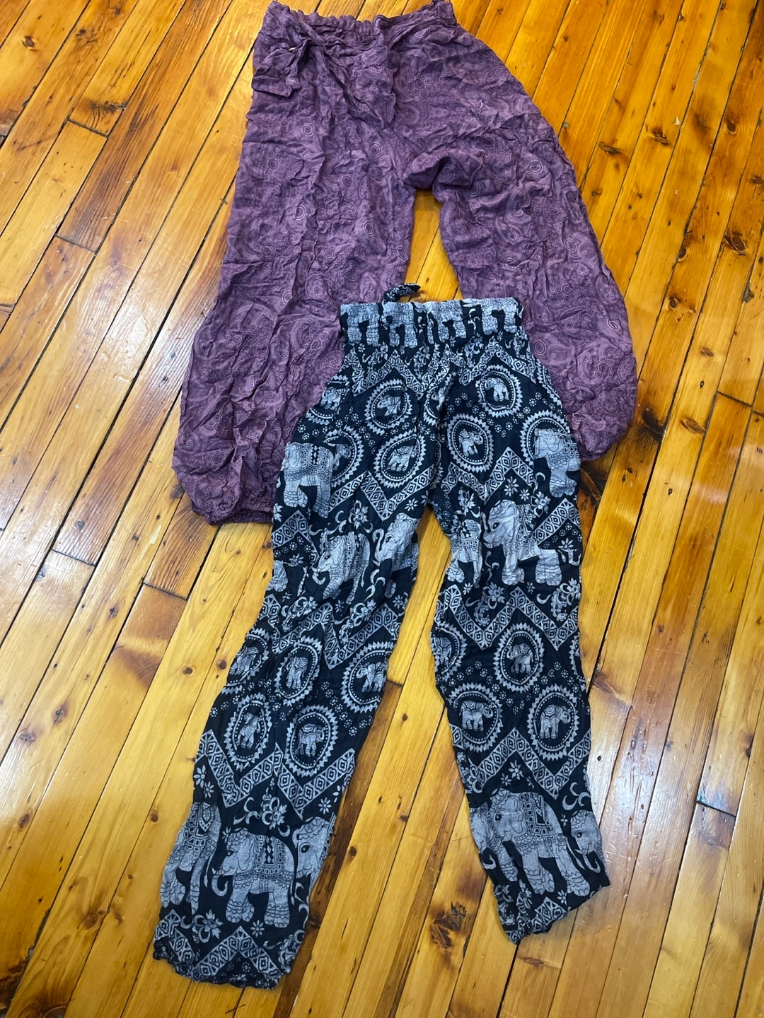 Two pairs of loose-fitting, elastic waist pants. One pair purple with a paisley pattern, the other black with an elephant pattern. Both are lightweight and comfortable.