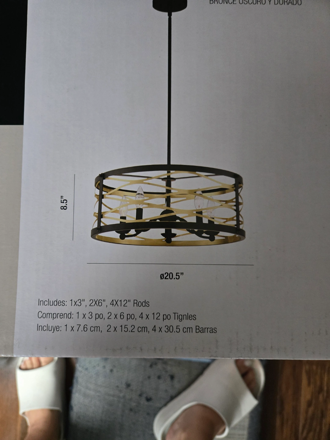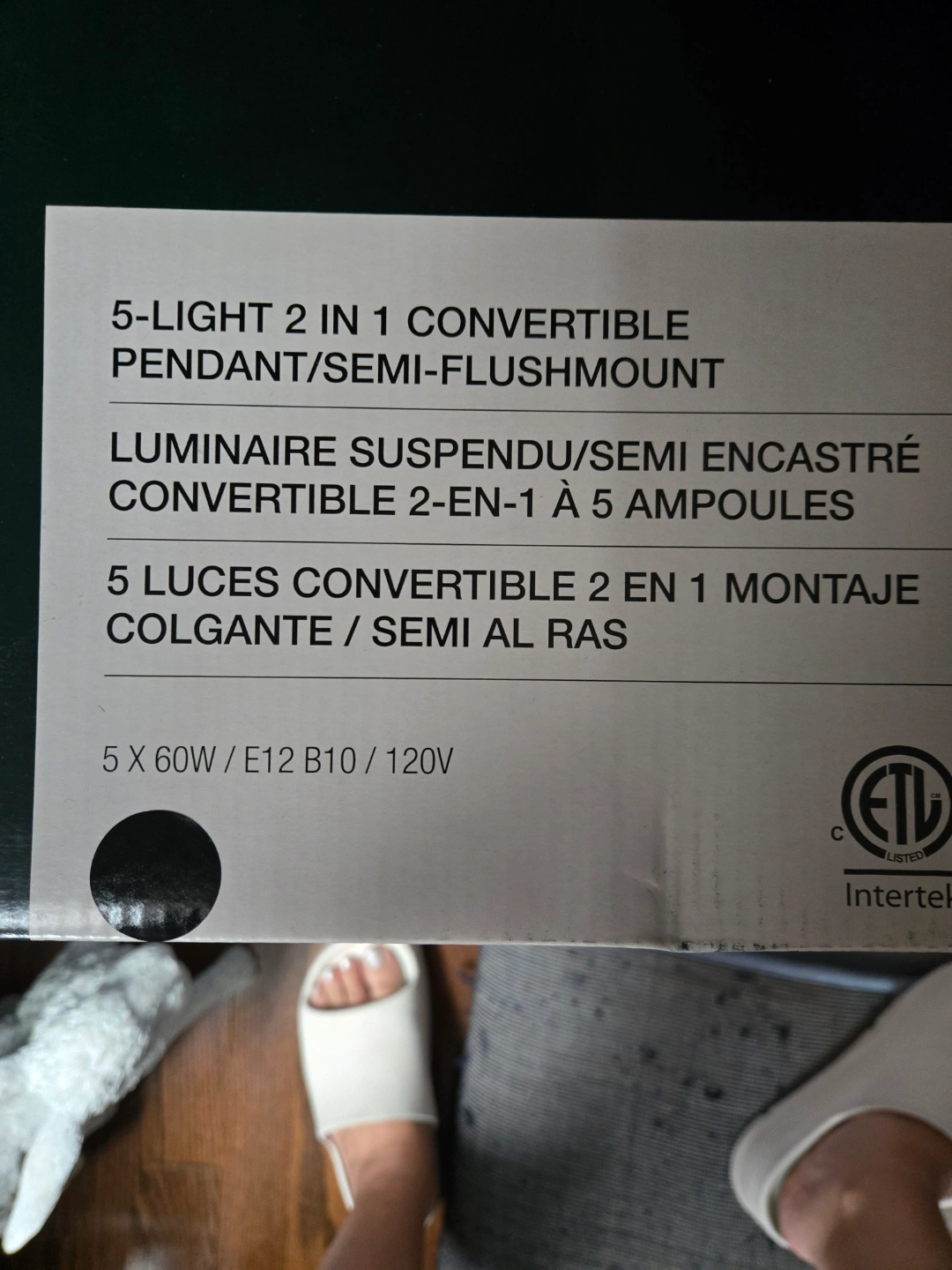 Five-light fixture, convertible pendant or semi-flush mount. Black and gold finish. Includes rods for adjustable height. Modern design. New box is unopened. pickup weston rd and Rutherford rd. Cash only.