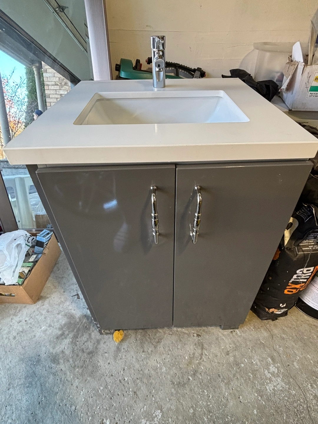 Grey vanity with white countertop. Includes sink and faucet. Two doors with silver handles. The left side of the vanity cabinet is unfinished, as it’s intended to be mounted against a wall on the left. WxDxH inches = 26x25x36