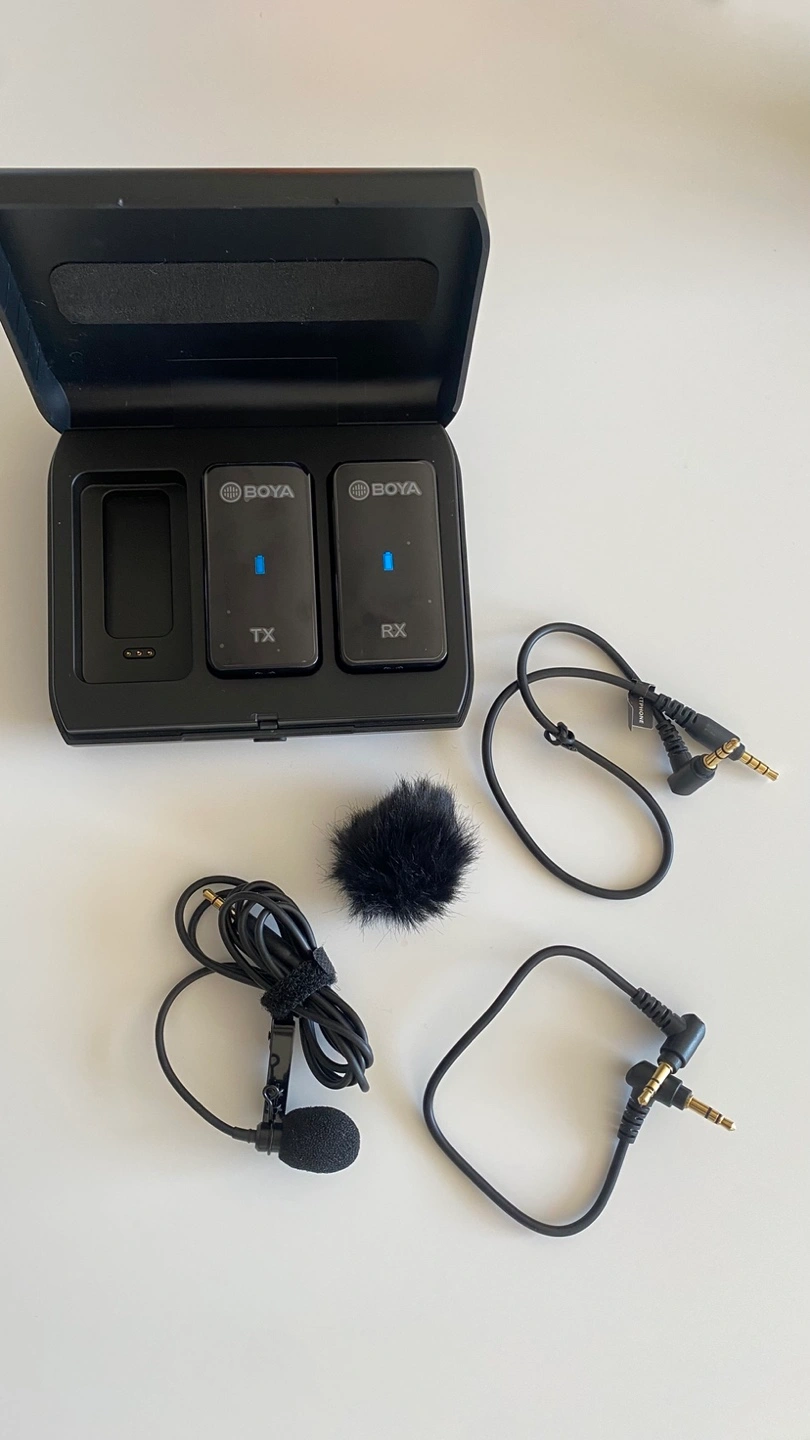 Wireless microphone system. Includes one transmitters, one receiver, two lavalier microphones, and a furry wind muff. Compact charging carrying case. Great for interviews and vlogging.