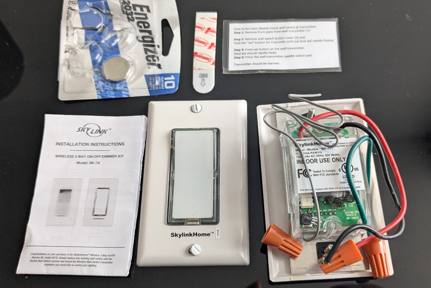 Includes switch, remote wireless switch, installation instructions, and extra Energizer battery. Indoor use only. Model SK-7A