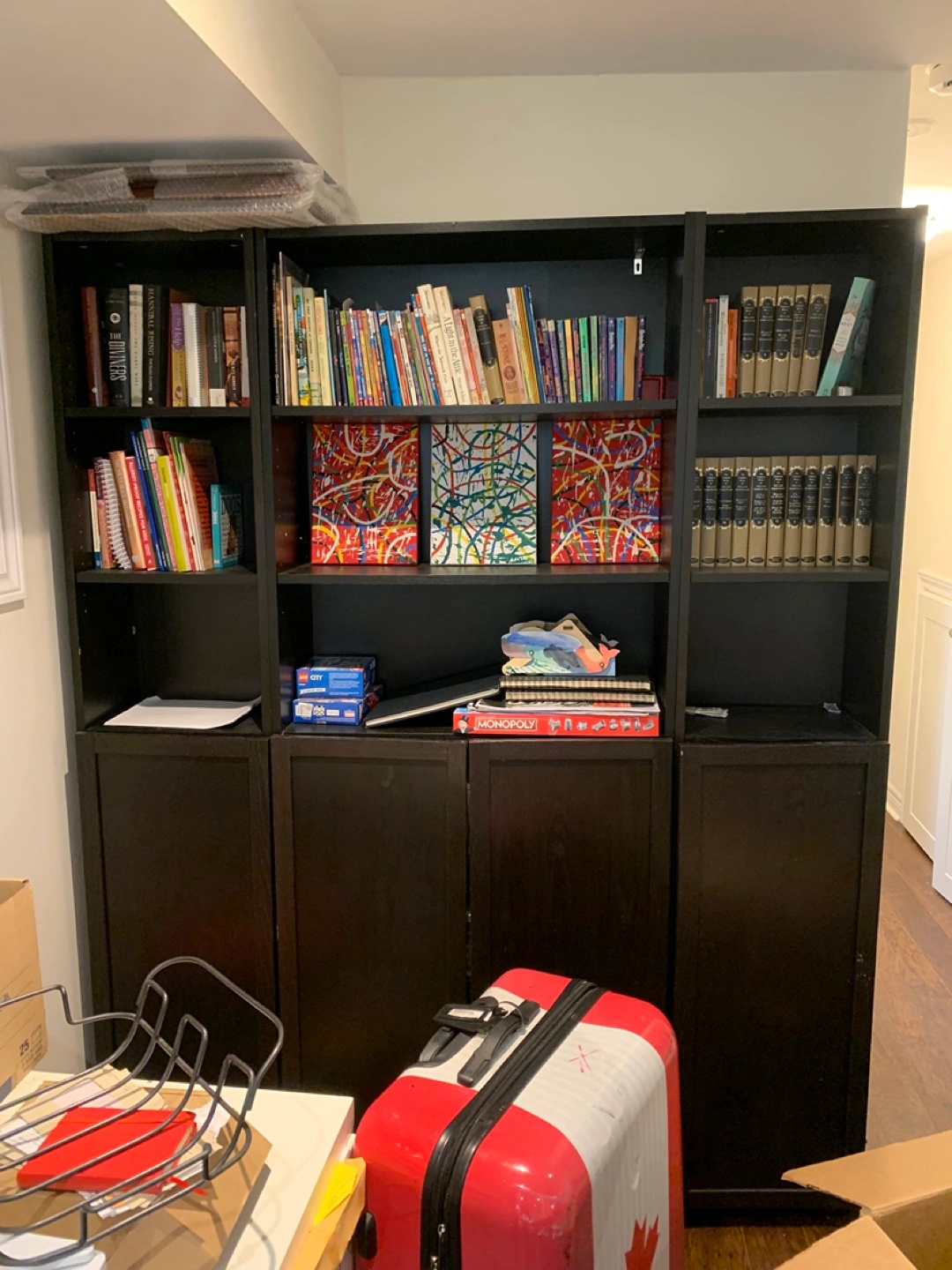 Large black bookcase, multiple shelves. Includes storage cabinets at the bottom. Oils and games can be included or sold without.
