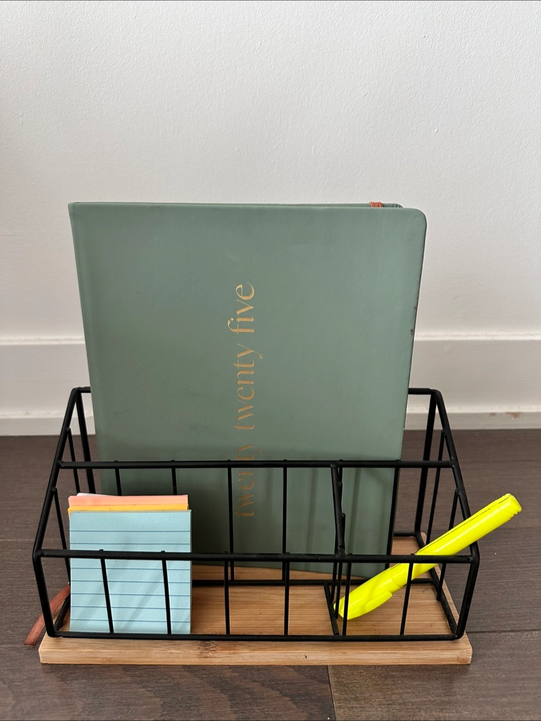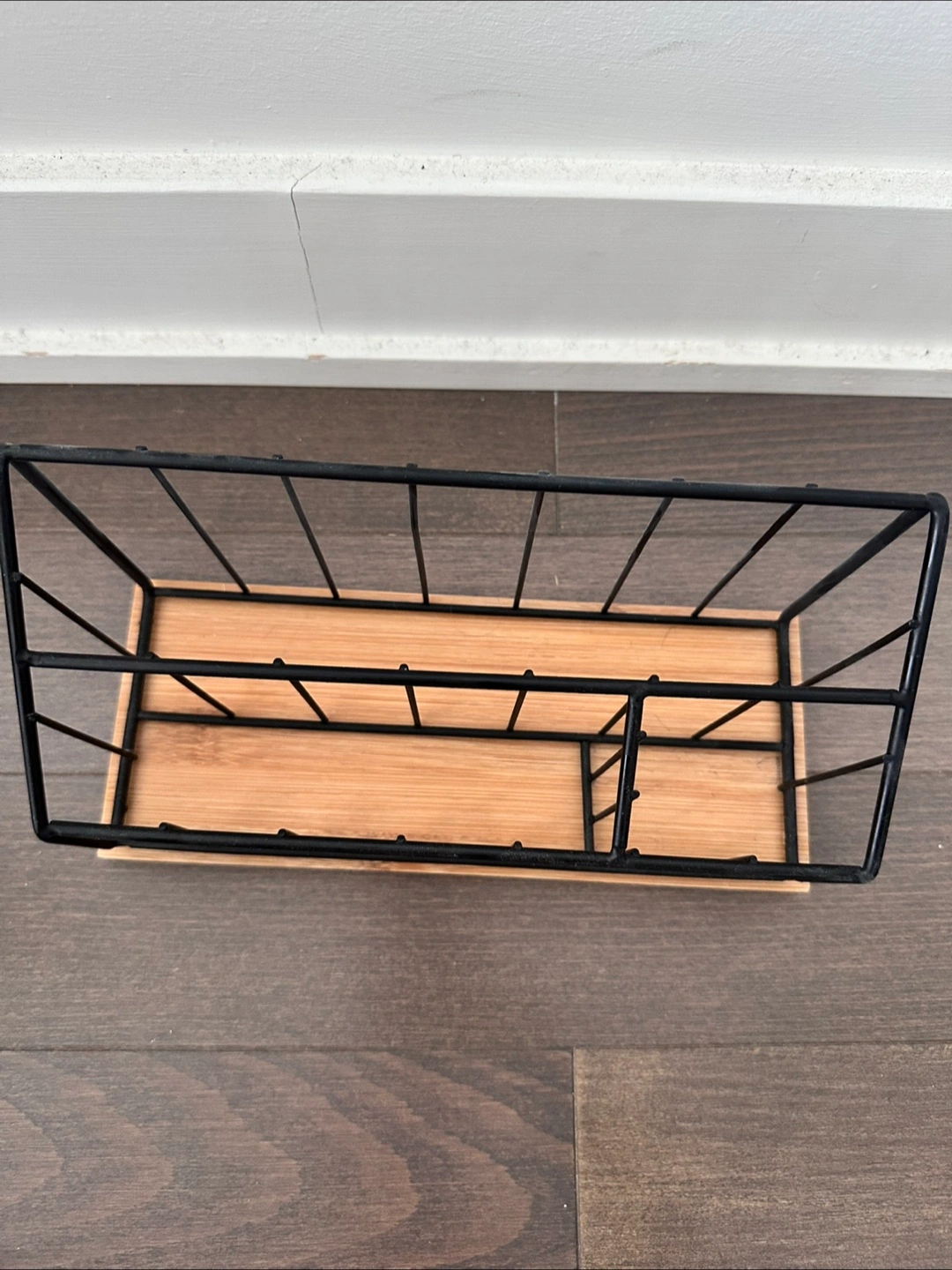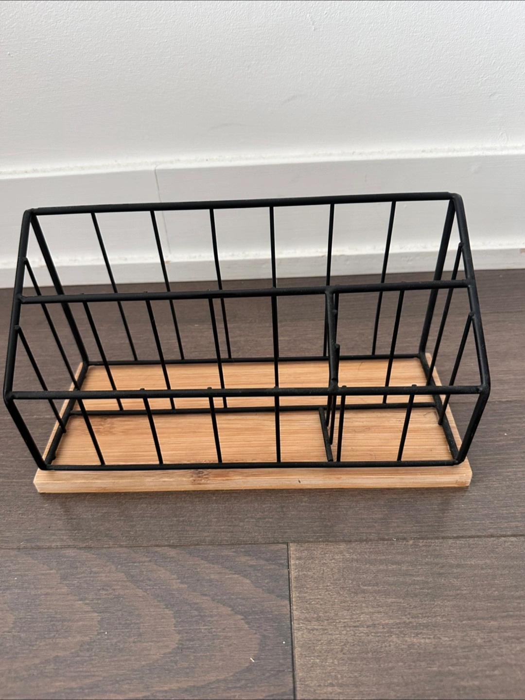 Stylish desk organiser. Black wire frame with bamboo base. Multiple compartments for pens, notebooks, and other stationery. Perfect for home or office.