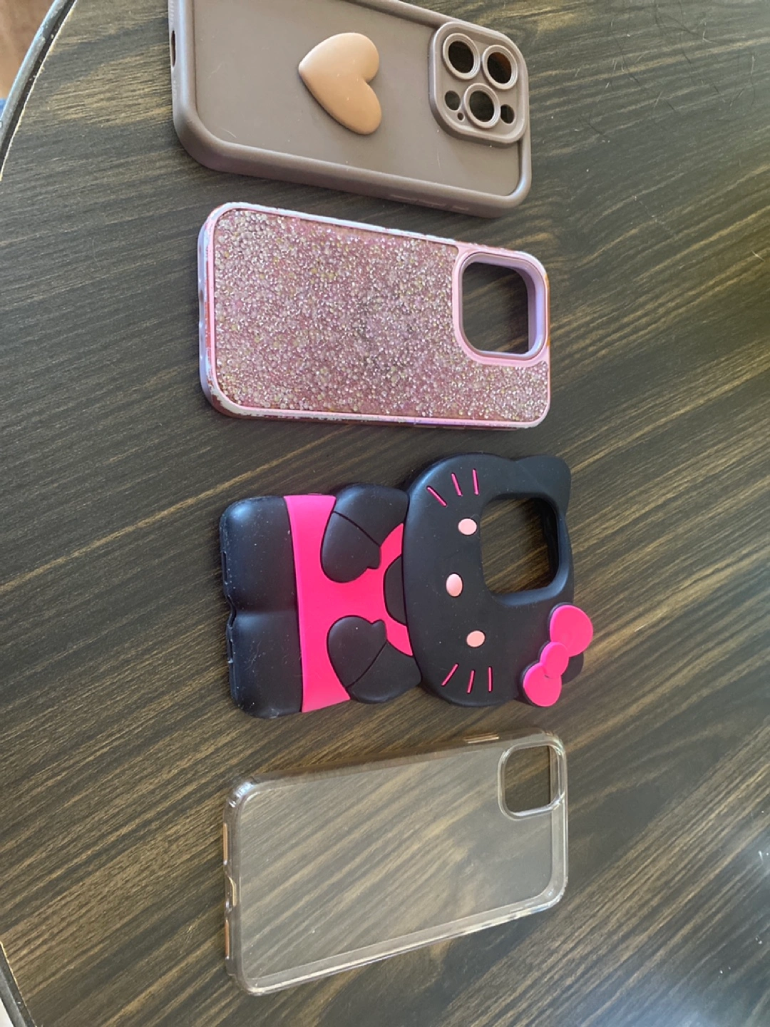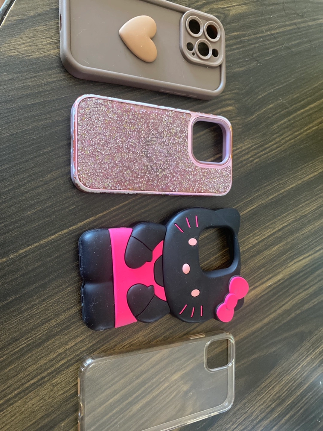 Four iPhone 12/13 phone cases. Various styles and colors. Includes one glitter, one Hello Kitty, one clear, and one solid color case. Great for everyday use or to switch up your style.