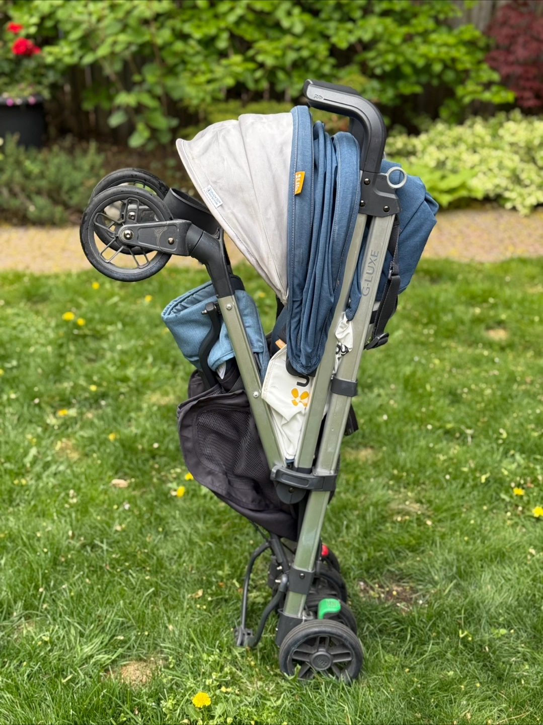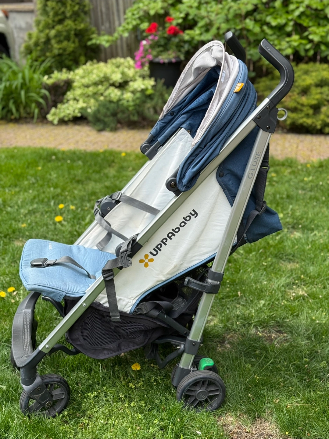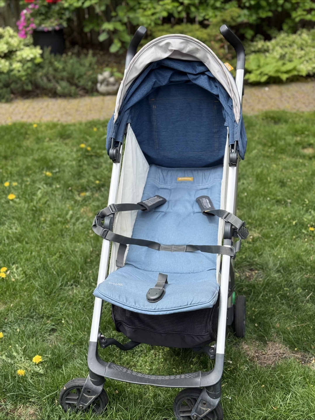 UPPAbaby G-LUXE stroller. Lightweight and easy to manoeuvre. Compact fold. Features a large canopy and storage basket. Denim blue colour. Used condition.
