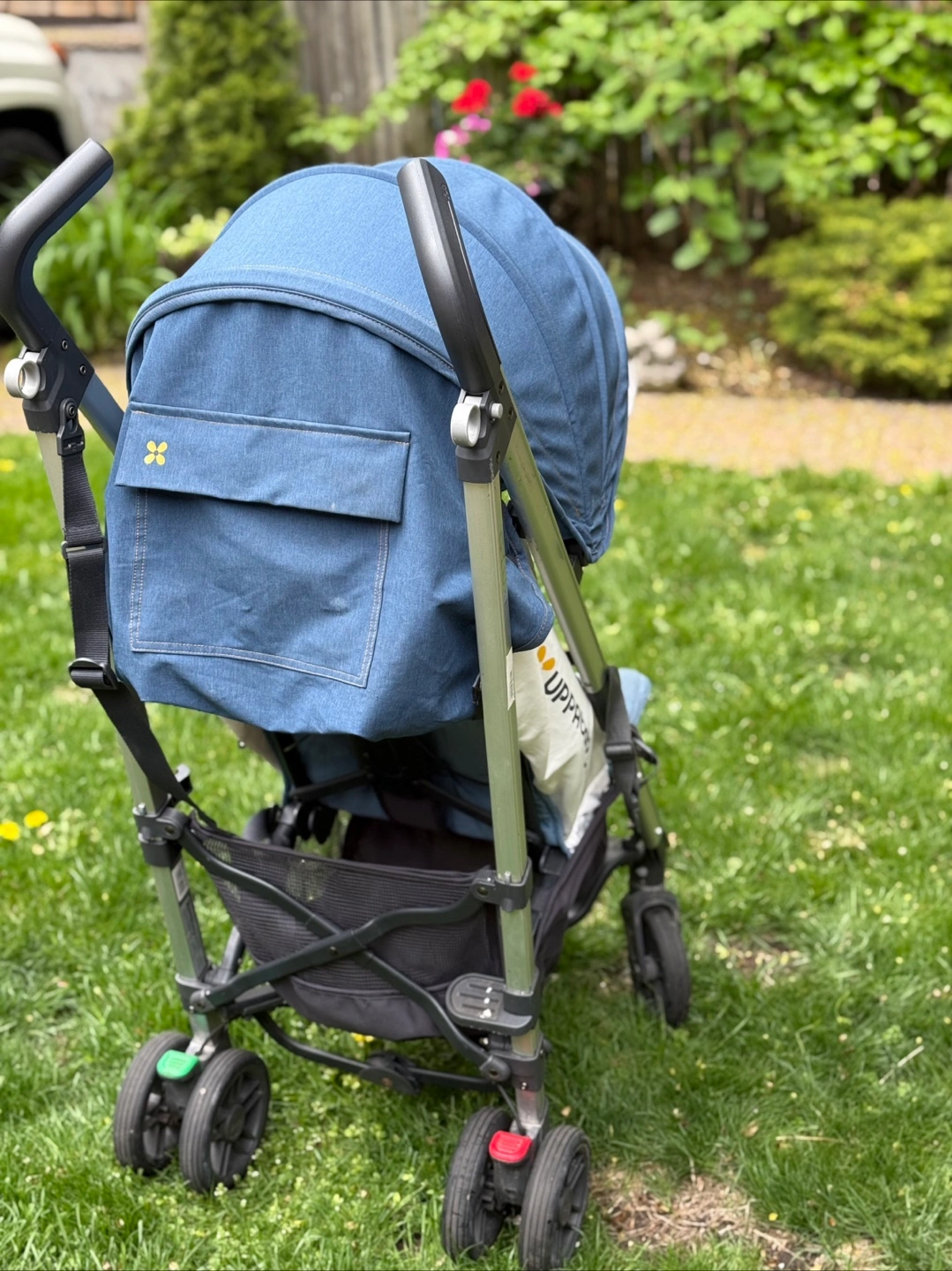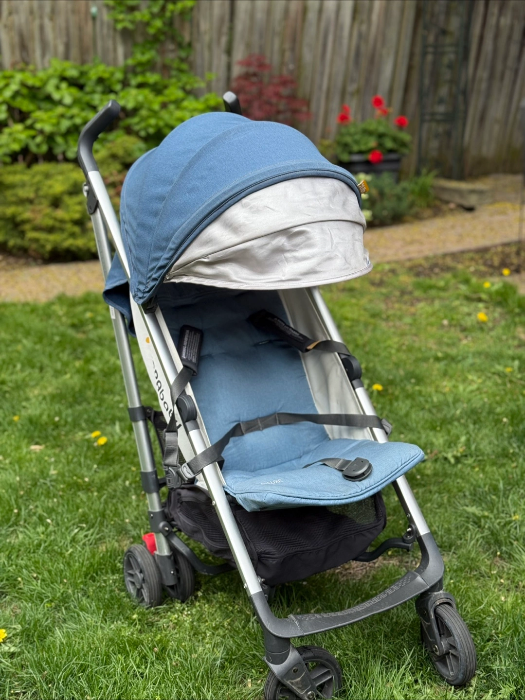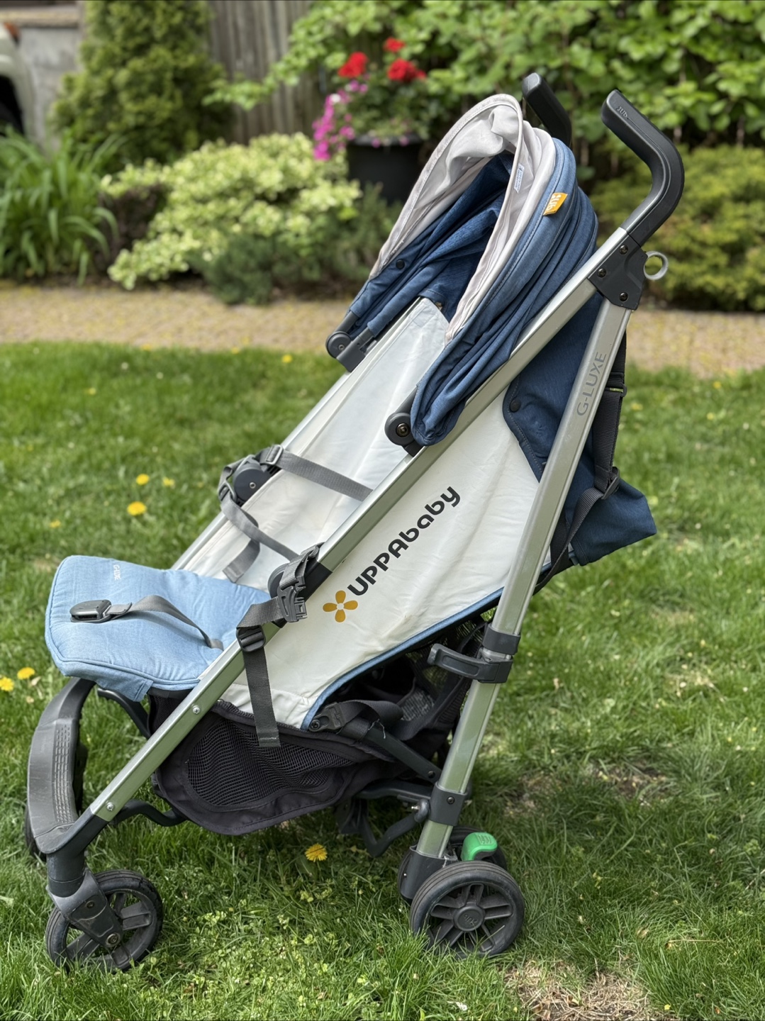 UPPAbaby G-LUXE stroller. Lightweight and easy to manoeuvre. Compact fold. Features a large canopy and storage basket. Denim blue colour. Used condition.