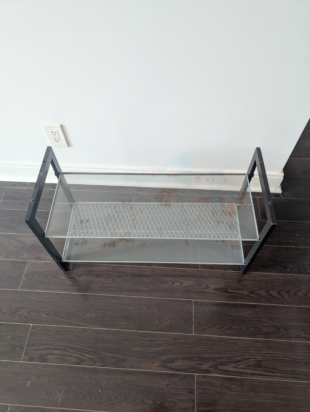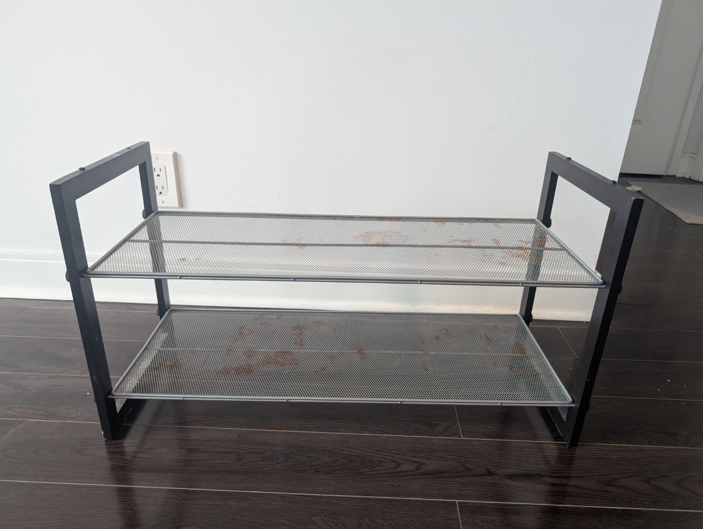 Two-tier metal shoe rack. Black metal frame. Grey wire shelves. Some rust spots on shelves. Good for small spaces.