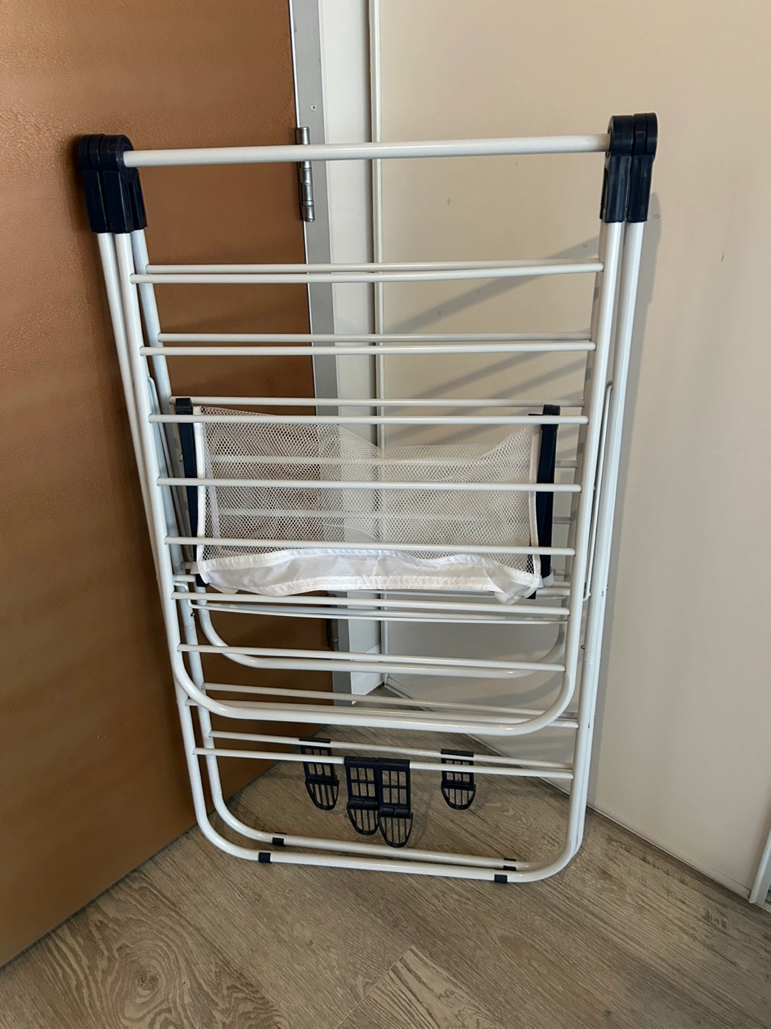 White foldable drying rack. Features a mesh laundry bag. Lots of drying space. Great for small spaces.