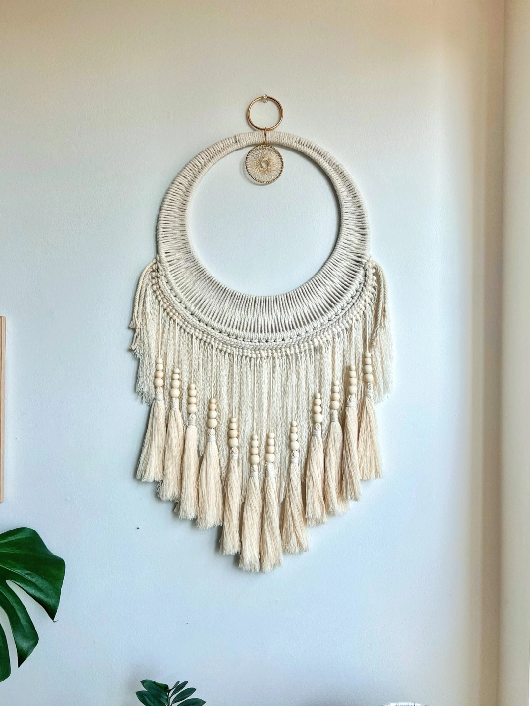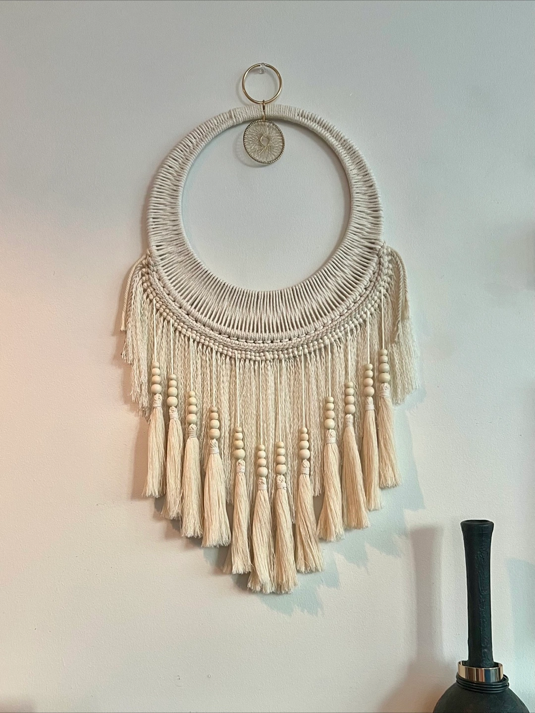 Bohemian wall hanging. Handmade with natural cotton macrame cord, wooden beads and metallic gold accents. Wrapped hoop design with tassels offers depth, texture, and subtle movement.