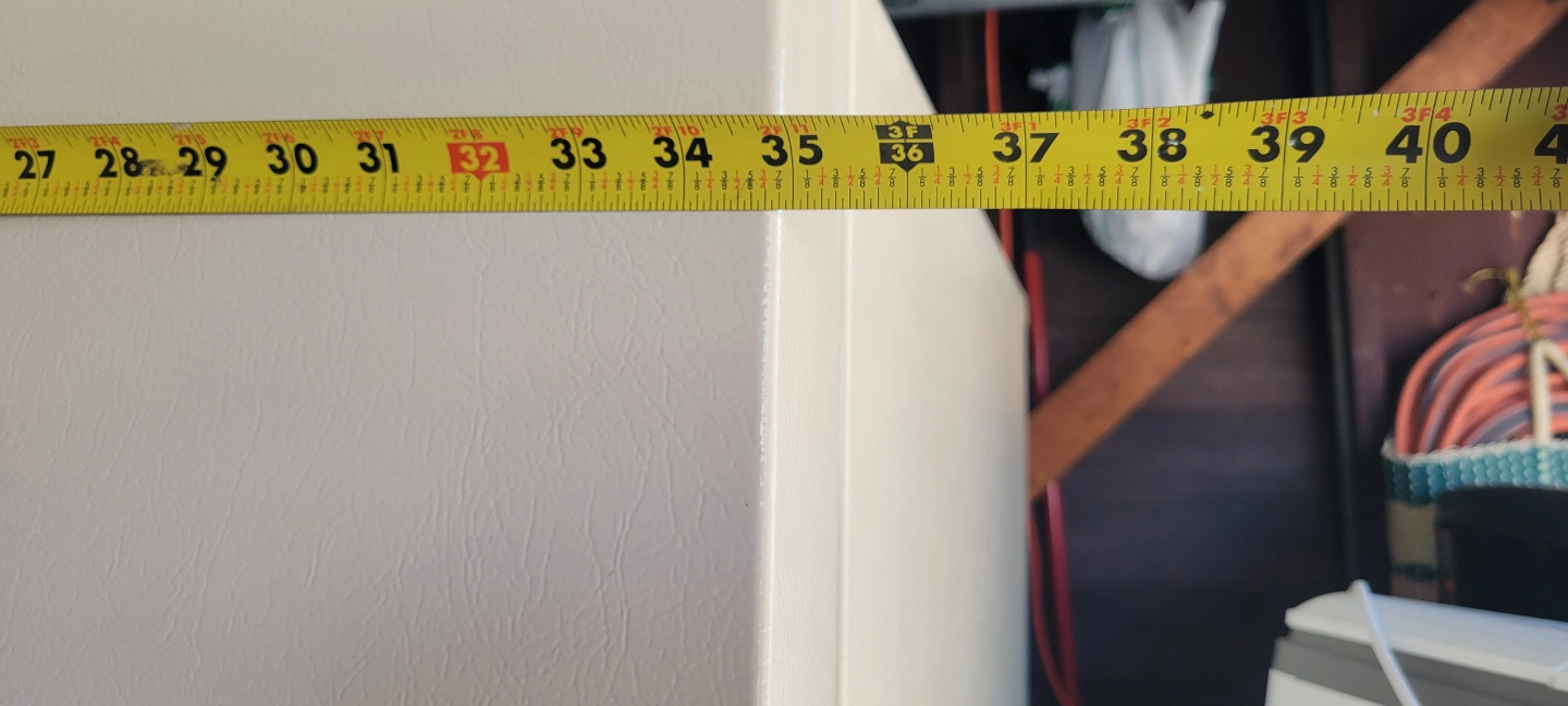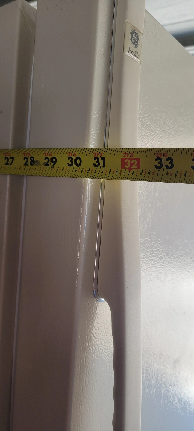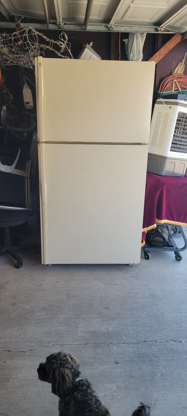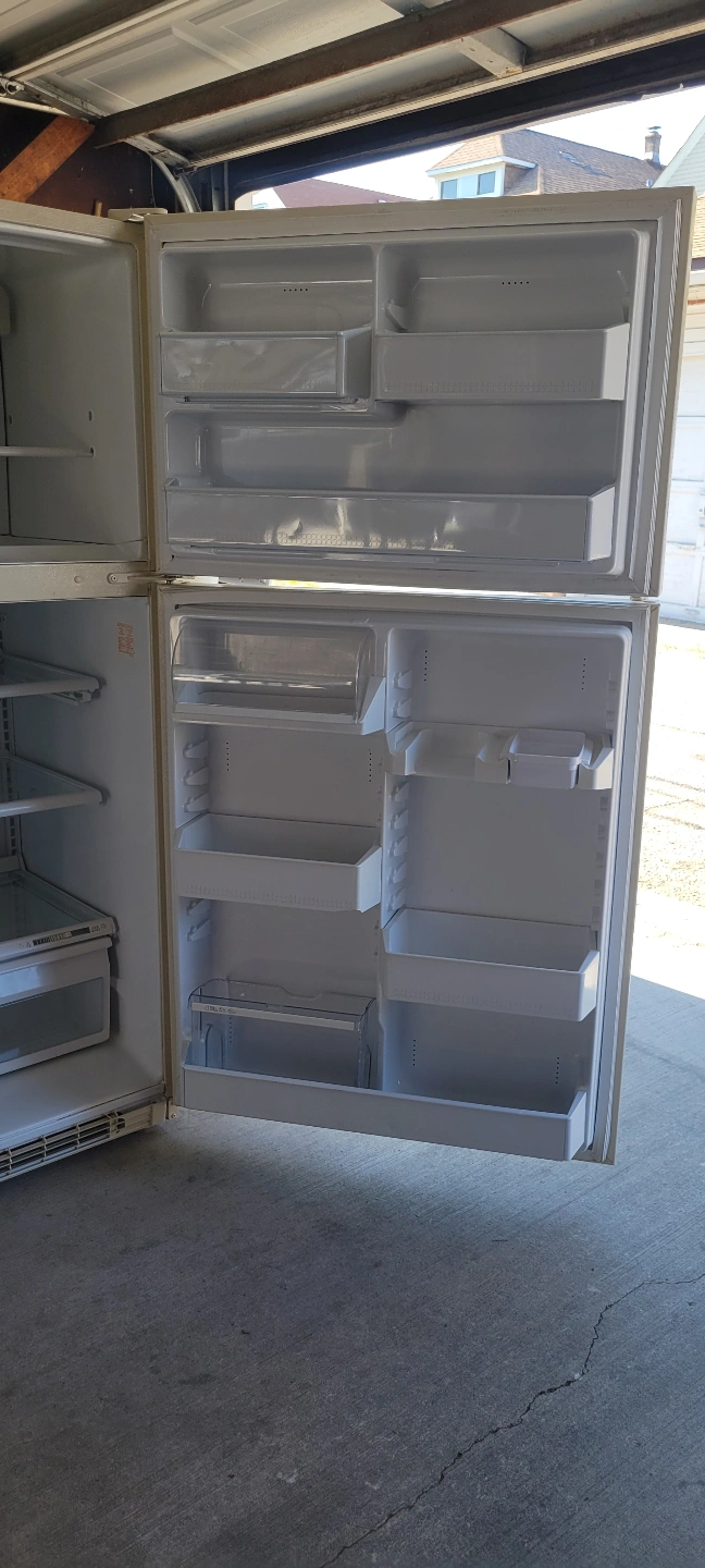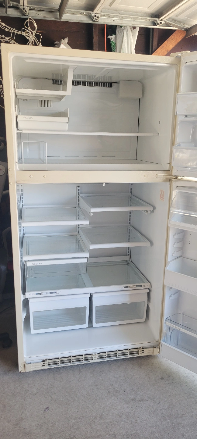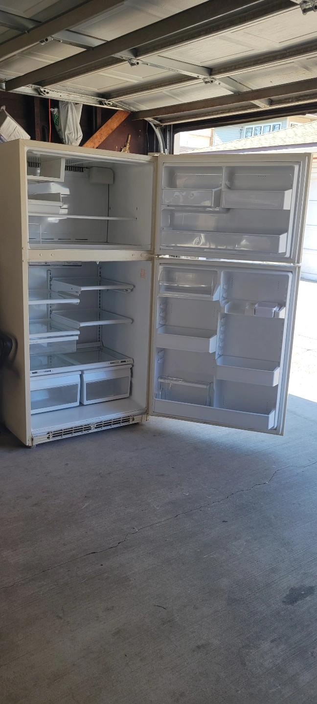 Used general eletric top freezer refrigerator. White. Approximately 36 inches wide. Multiple shelves and drawers. Good working condition.