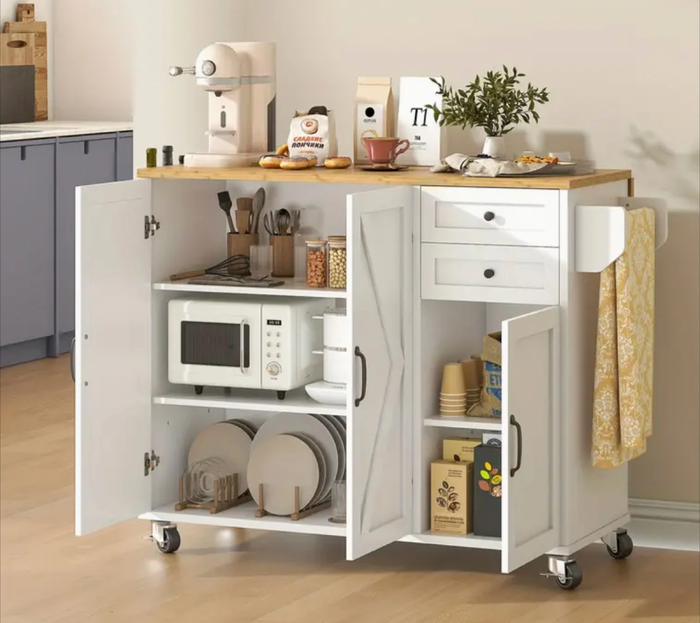 Rolling kitchen cart, white cabinet with butcher block top. Two doors, two drawers, microwaveable space. Towel rack. Great for small kitchens.