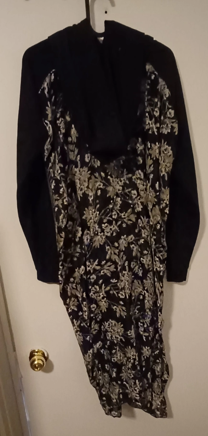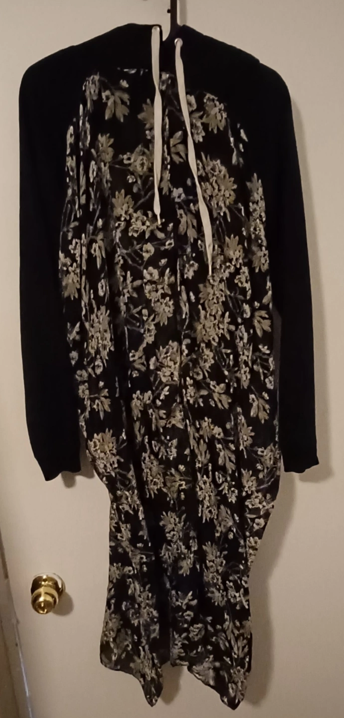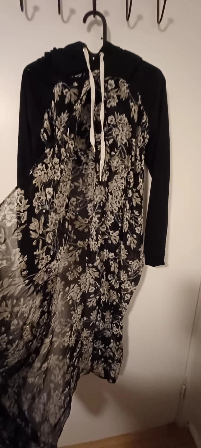 Long-sleeved hooded shrug. Features a black sweatshirt-style bodice and a sheer floral overlay. Relaxed fit. Drawstring hoodie. Looks great with jeans or over a tight dress. Rad-cycled from an old hoodie and a scarf.