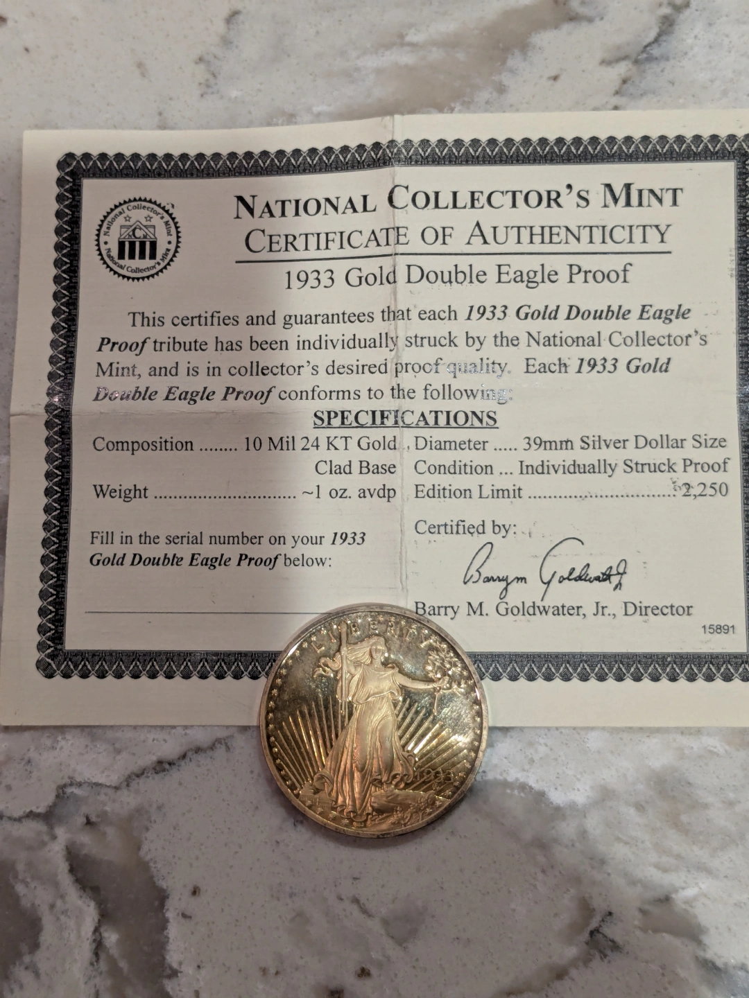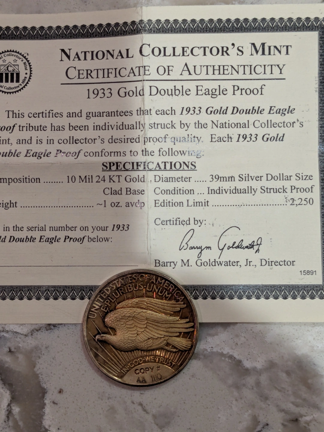 National Collector's Mint 1933 Gold Double Eagle Proof coin. Individually struck proof coin. Certificate of Authenticity included. 10 Mil 24 KT Gold. 39mm diameter. Limited edition of 2250.COPY