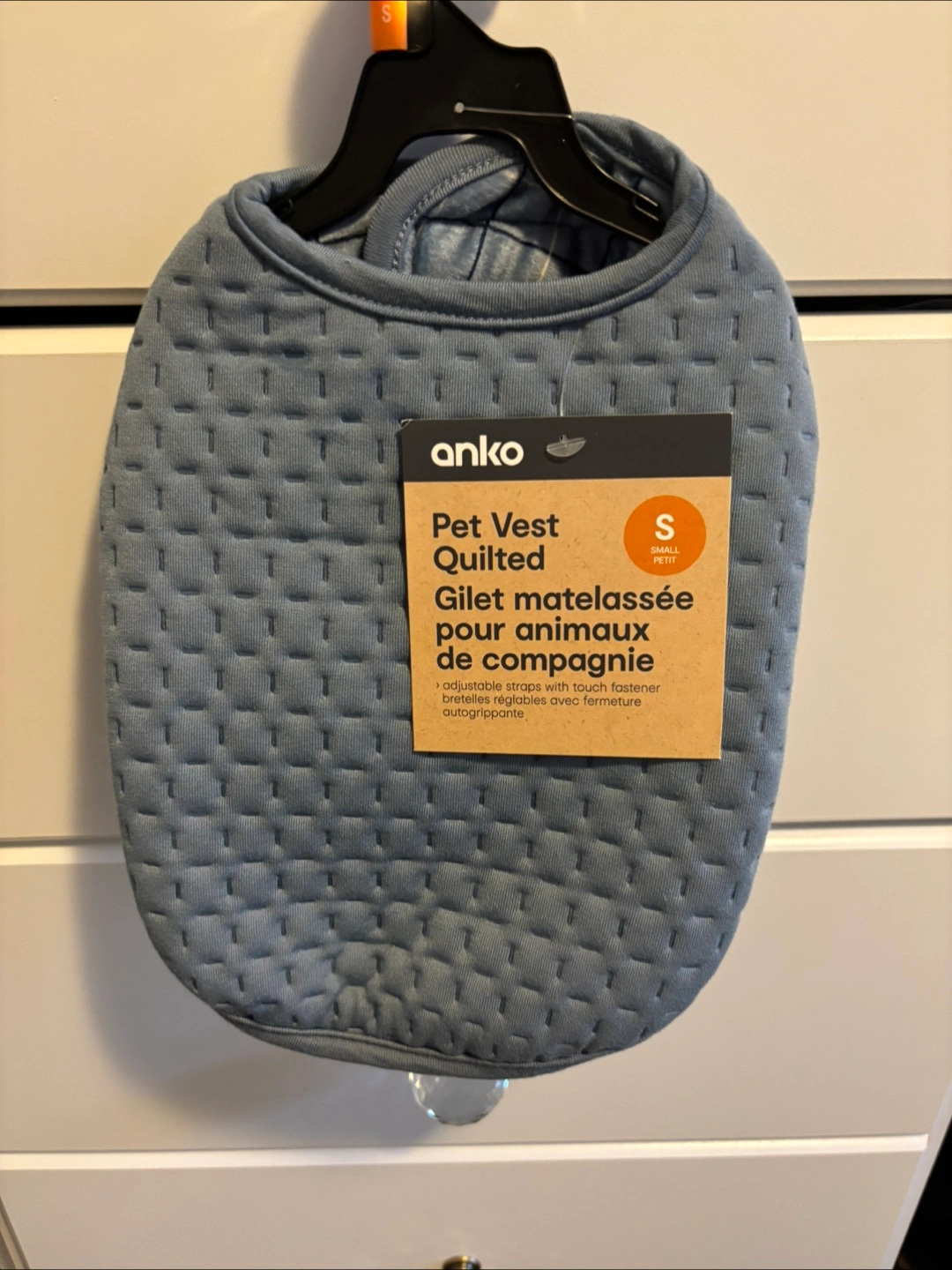 Blue quilted pet vest. Size small. Super soft. Doesn’t fit my pooch and cannot be returned as it was purchased from The Bay closing sale.