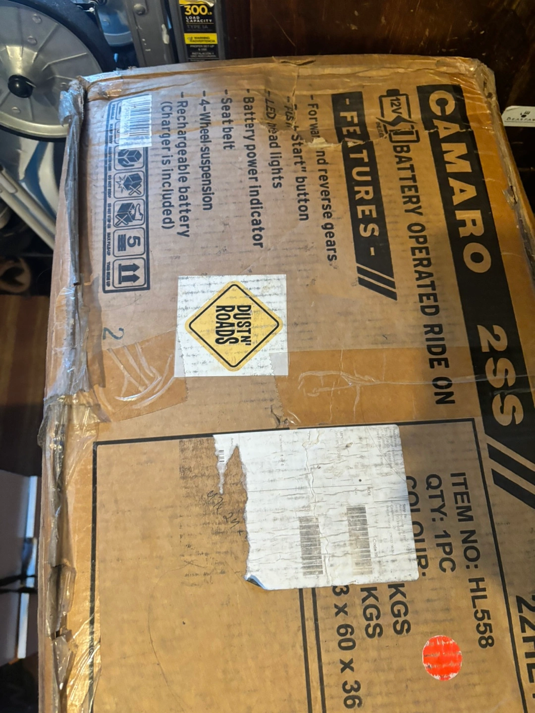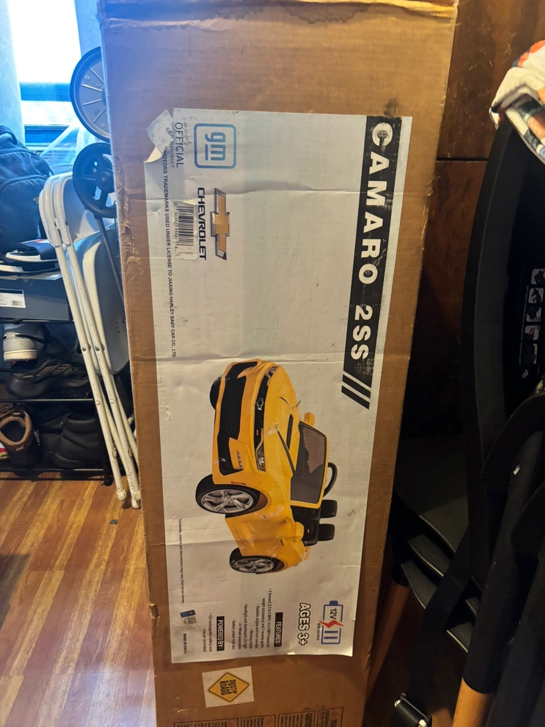 Brand new in box. Red Camaro 2SS kids ride-on car. Features forward and reverse gears, LED lights, start button, battery power indicator, and 4-wheel suspension. Includes charger. Ages 3+. Box shows some wear.
