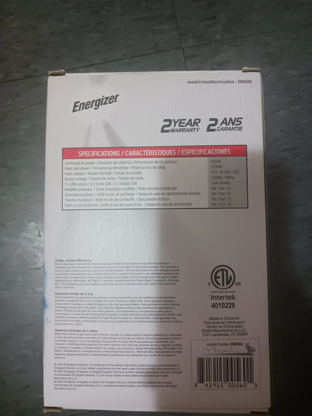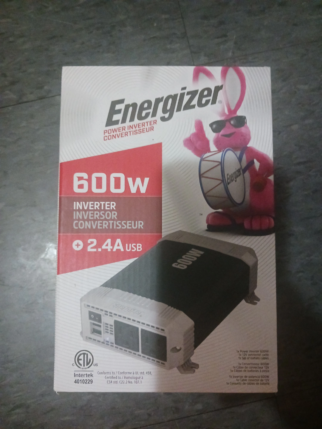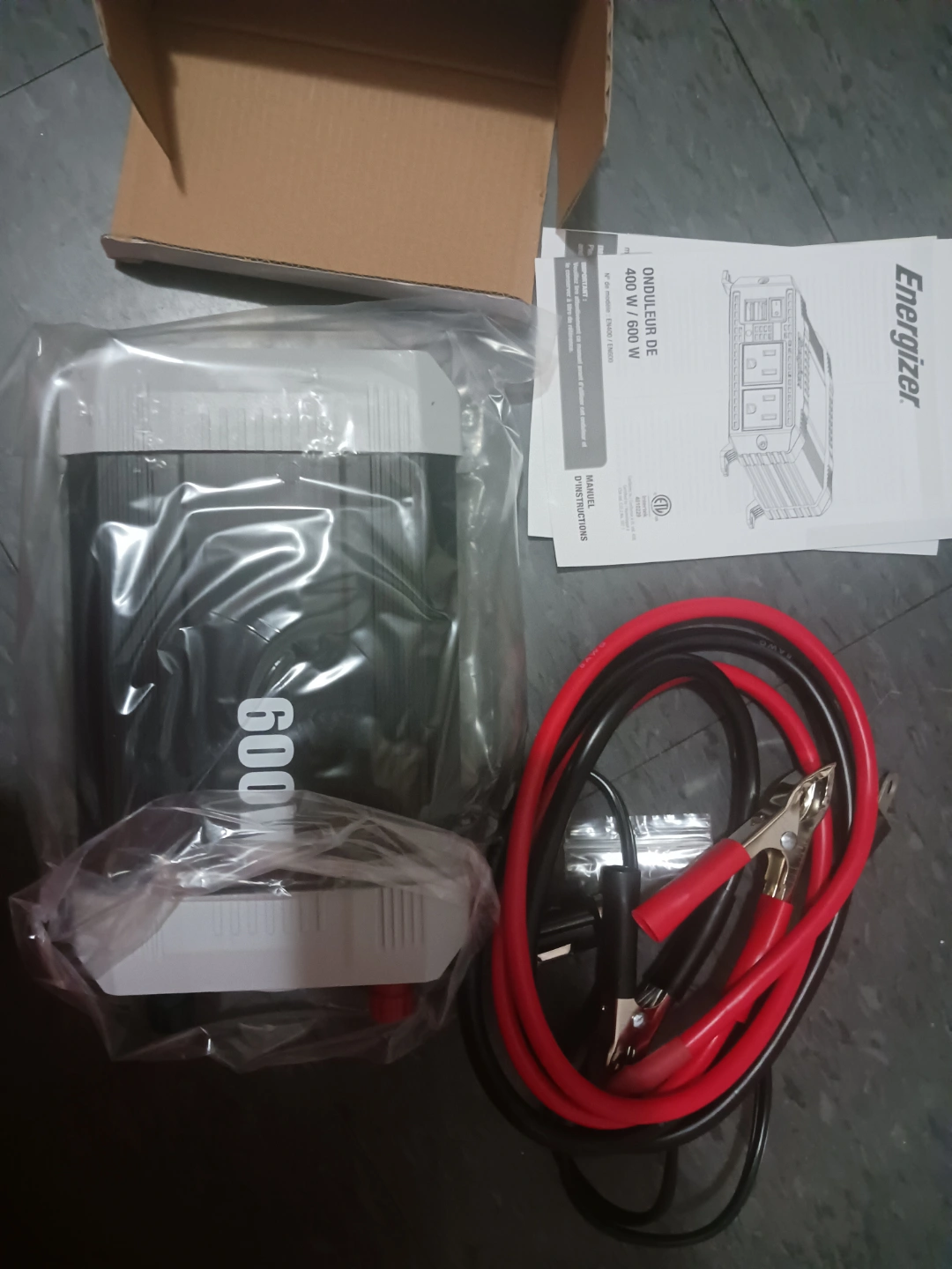 New, in box. 600W power inverter. Includes battery clips and instruction manual. 2.4A USB port.