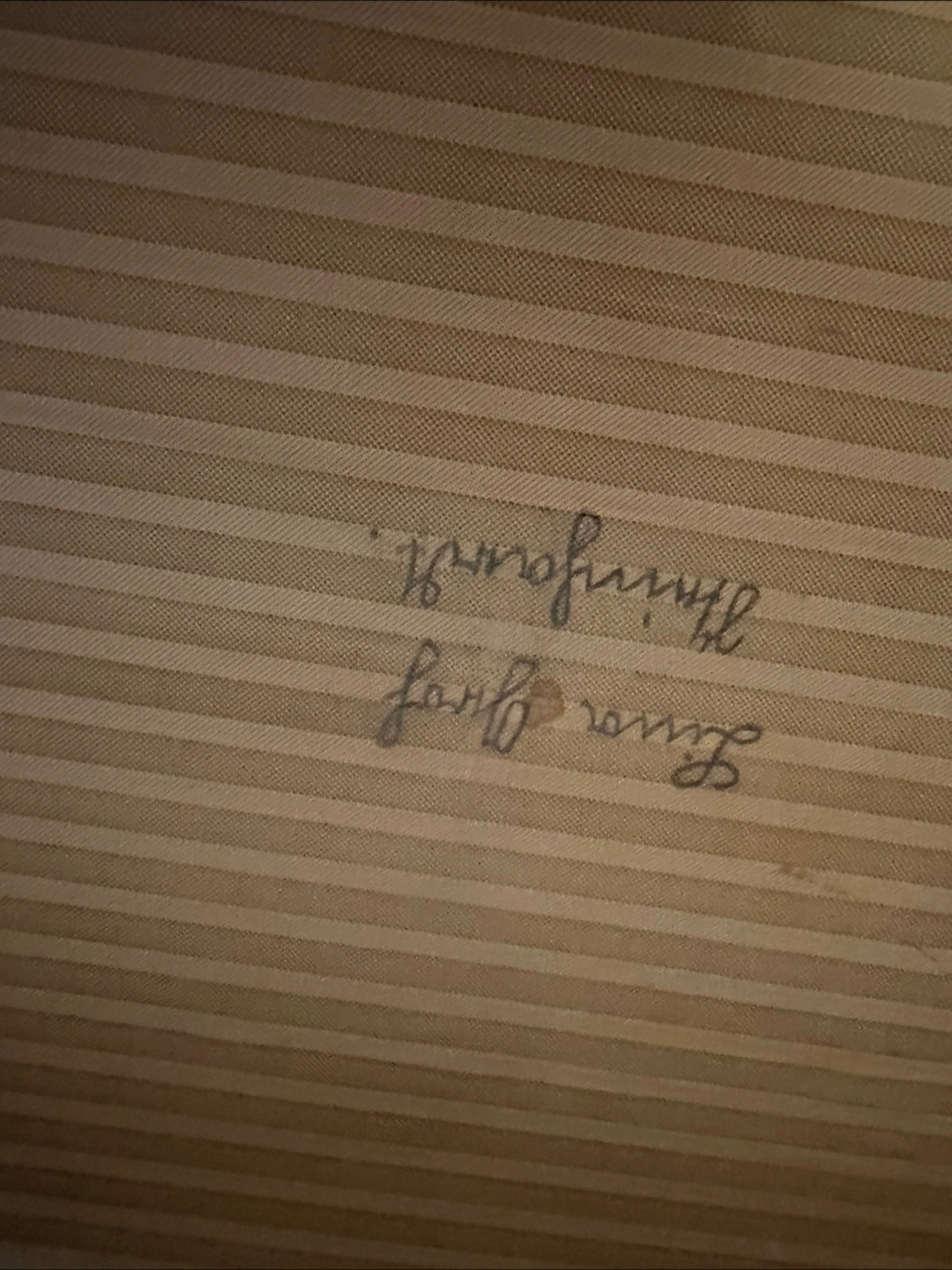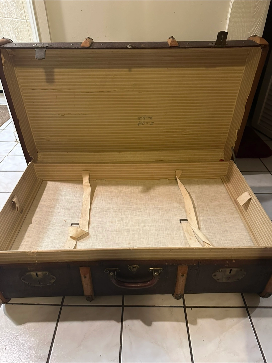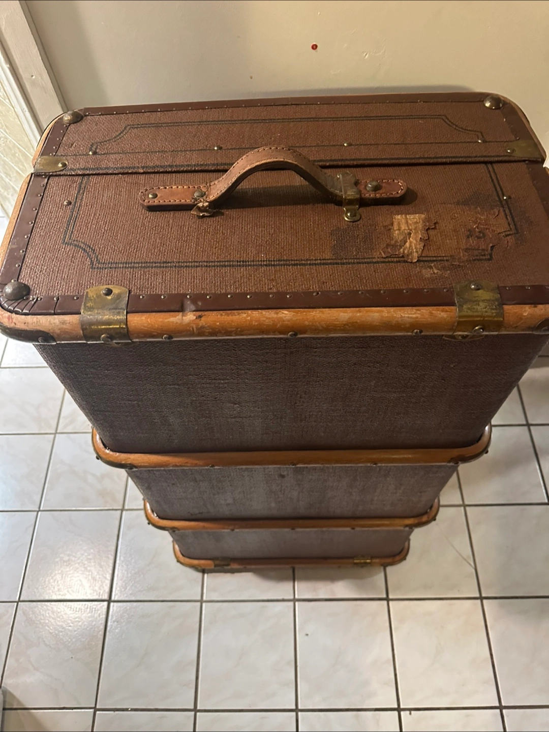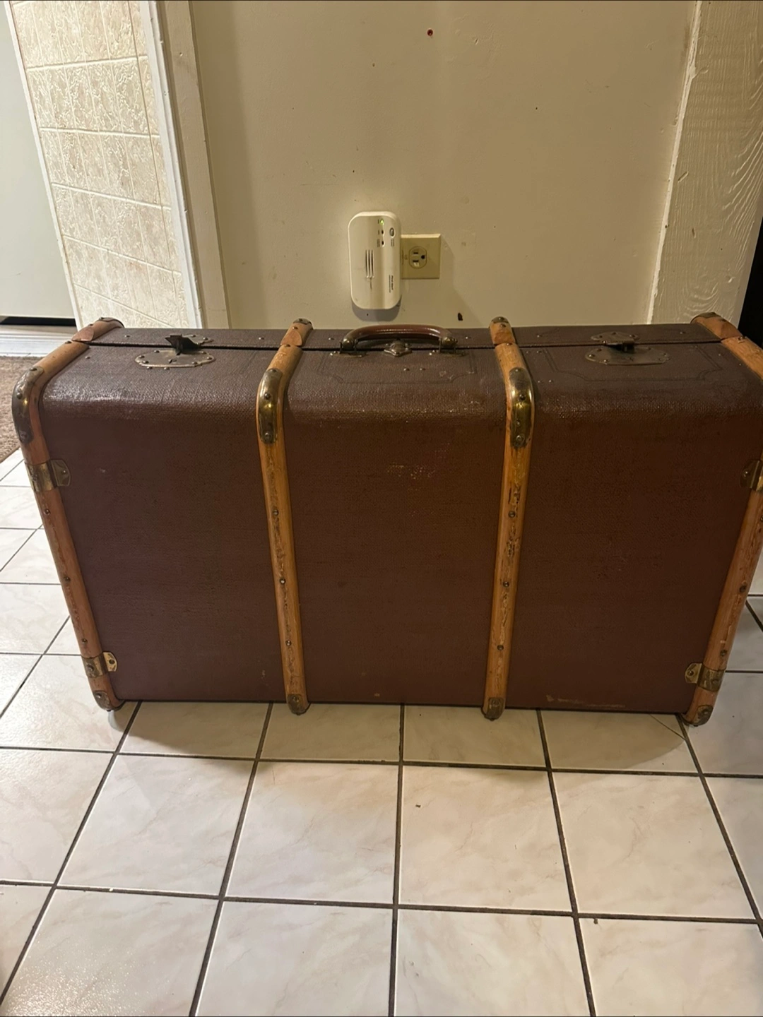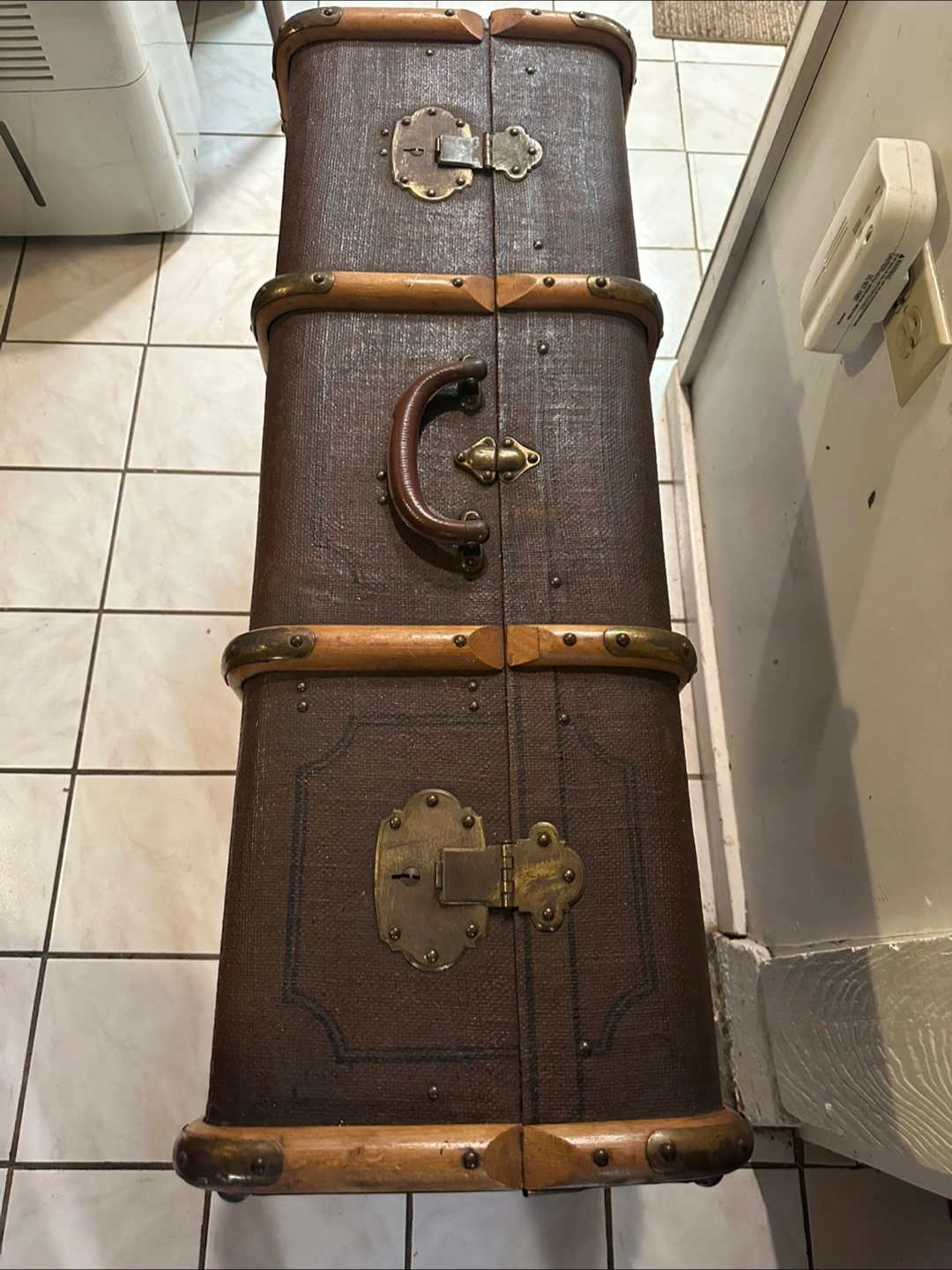Large vintage trunk. Brown fabric exterior. Wooden trim. Brass hardware. Interior fabric lining. Two latches. Top handle. Shows wear consistent with age.
