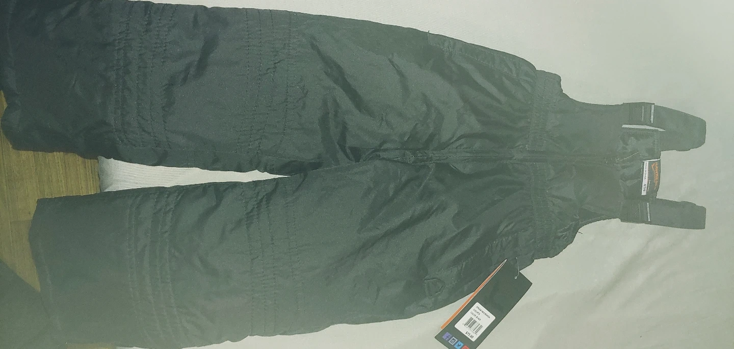 Black snow pants. Size 4T/4. Features include: elastic waistband, knee patch, pockets, adjustable shoulder straps. Weather and wind resistant. Insulated. Machine washable. HK Heat.