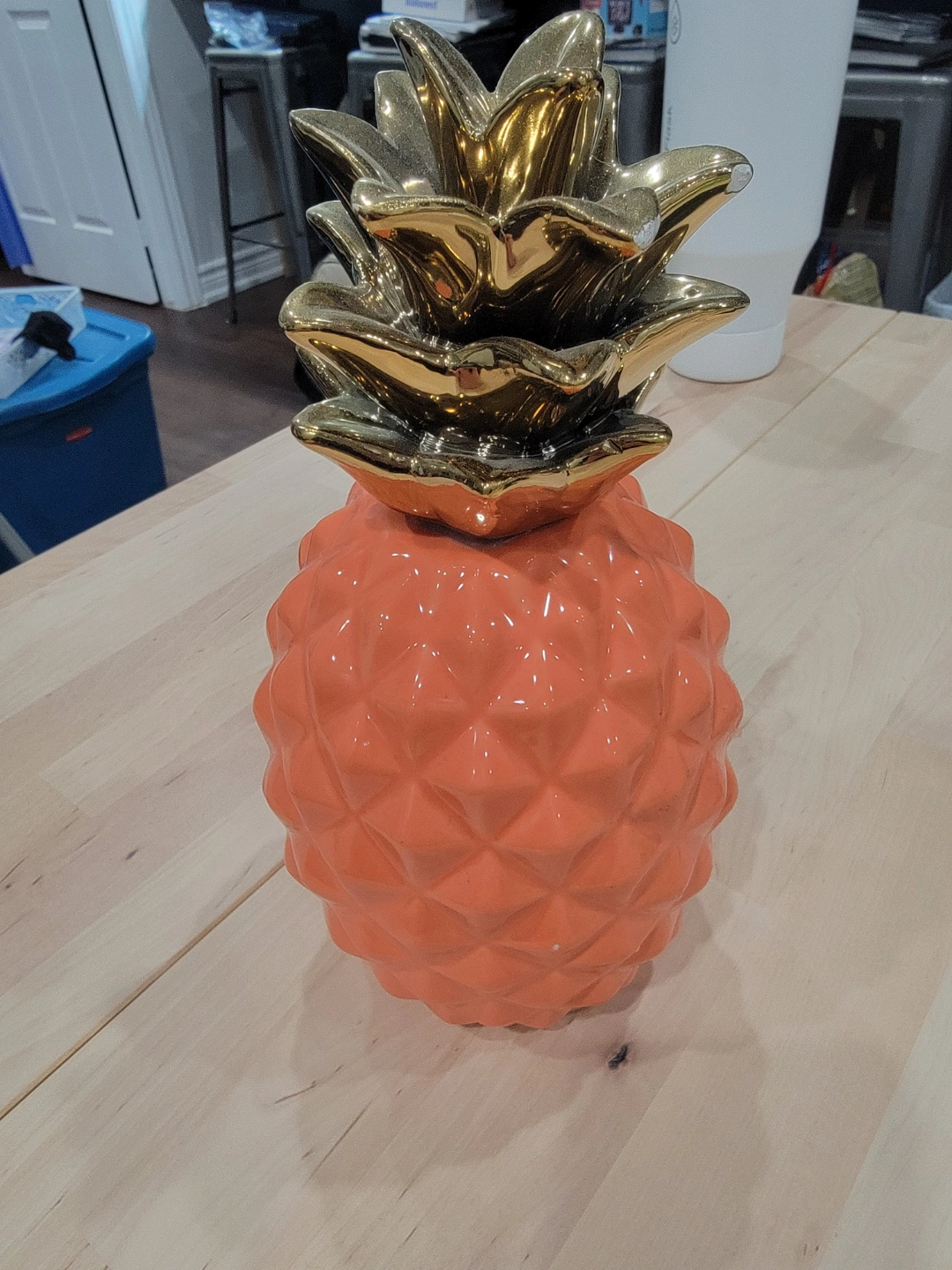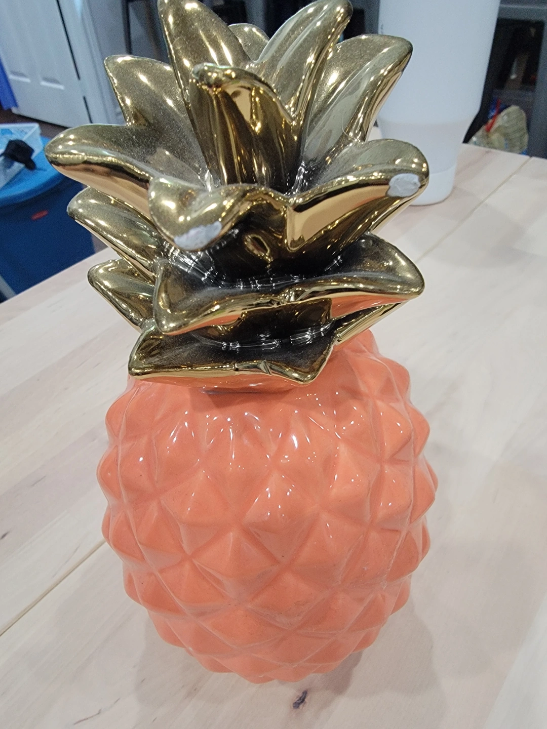 Ceramic pineapple decor. Orange body with gold top. Great accent piece for a summery theme. Small chip on the top as seen in the picture