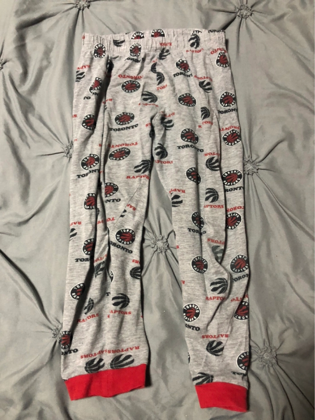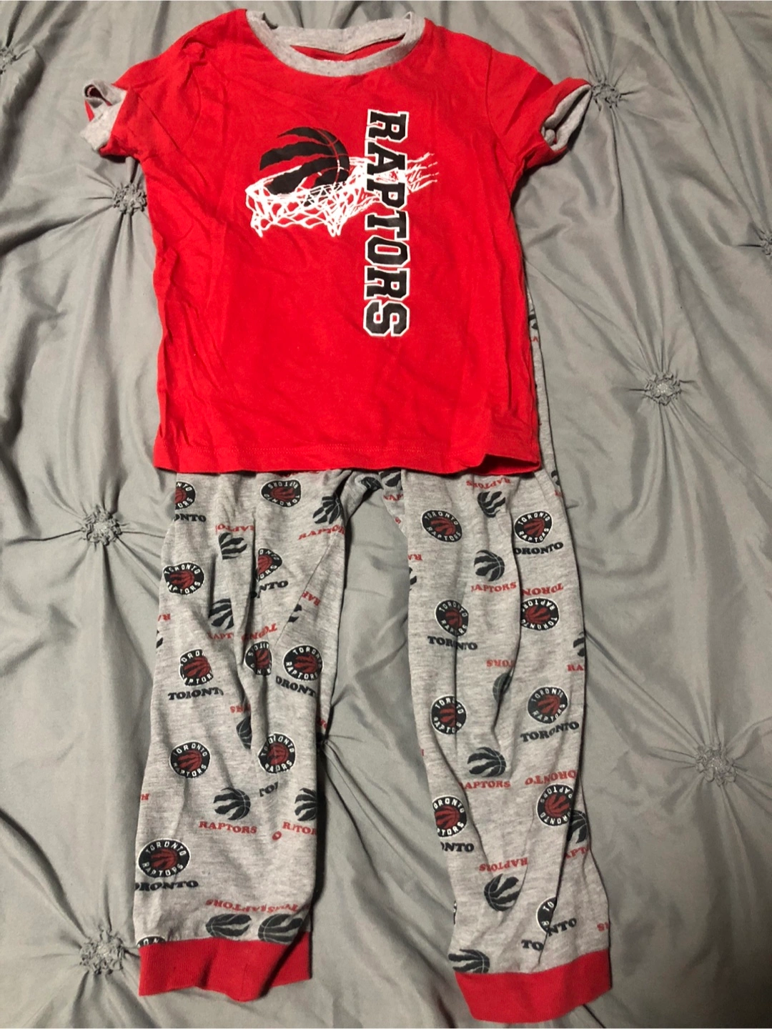 Kids Toronto Raptors pajamas. Red shirt, grey pants. NBA licensed. Short sleeve shirt and long pants.