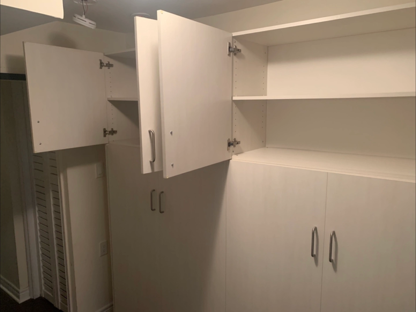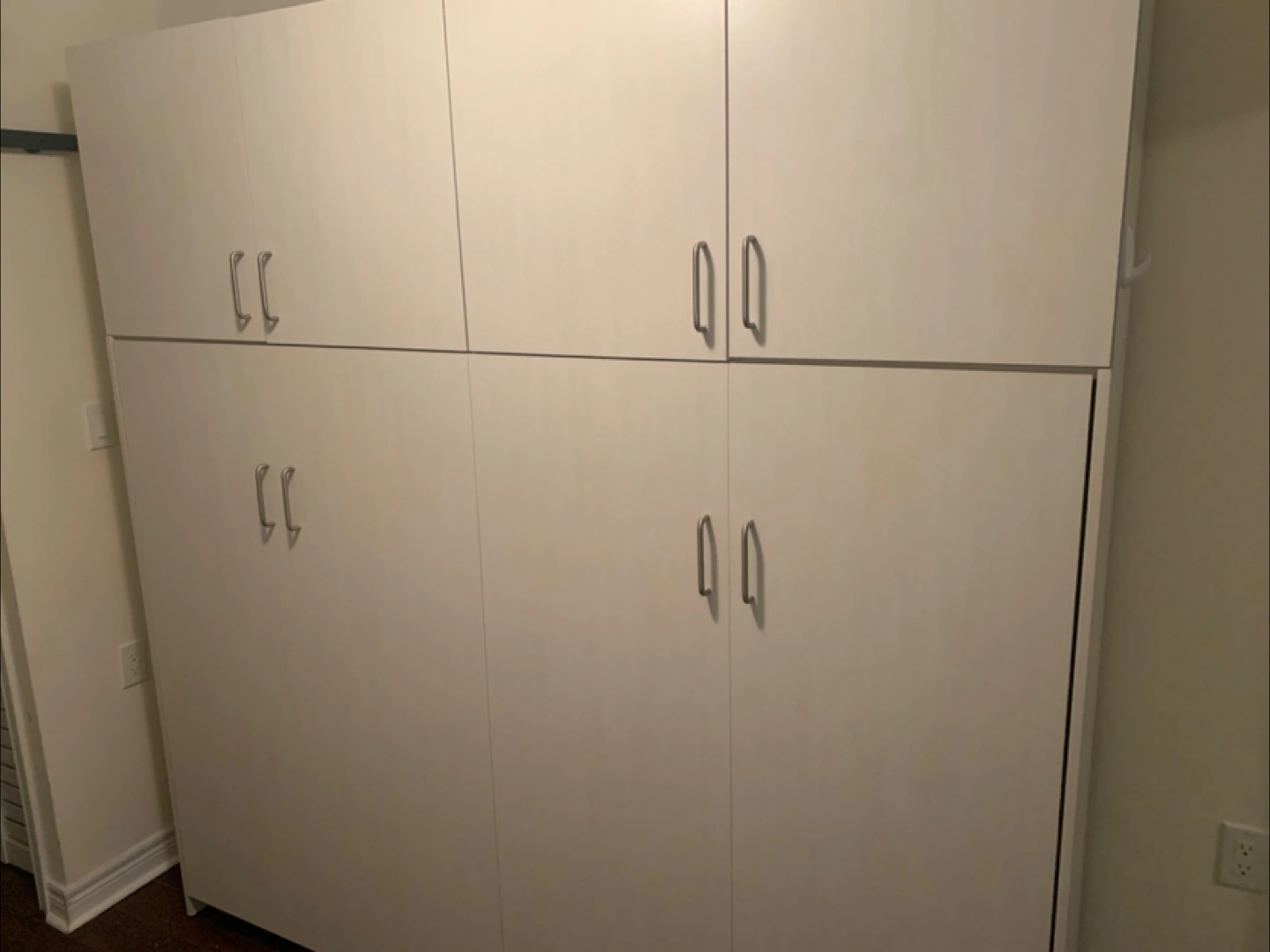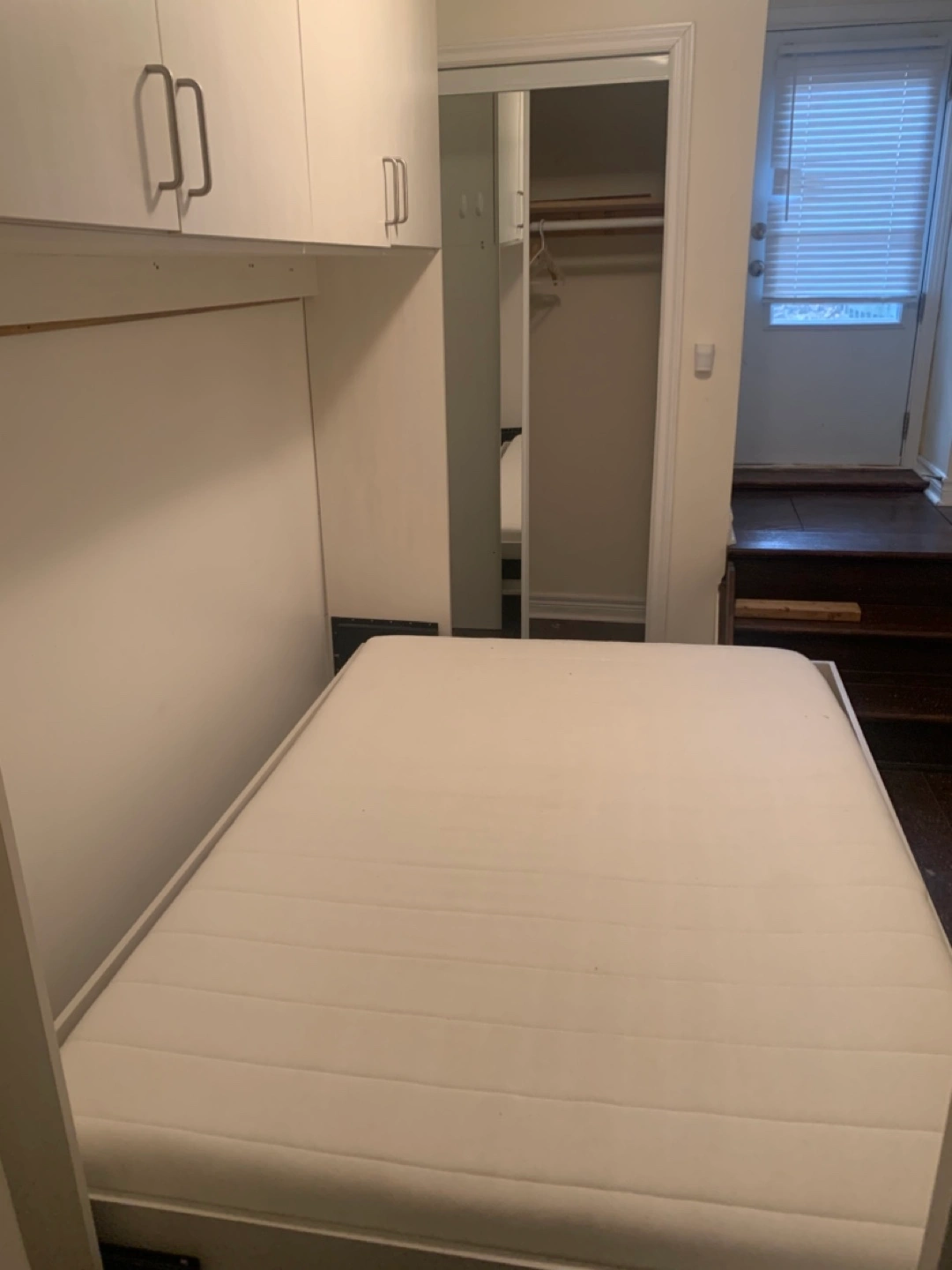 Rarely used. Space-saving Murphy bed with storage. Some minor damage visible in one cabinet where I had to cut a hole to access my water shut of valve to outside. See picture. Mattress included. Available for pick up Friday may 16th. Cash only.