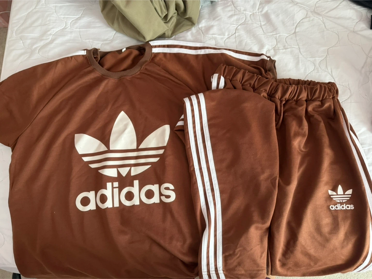 Selling a cute Adidas matching set in a brown colour. It includes a t-shirt and shorts with the classic three stripes. Perfect for a casual and sporty look!
