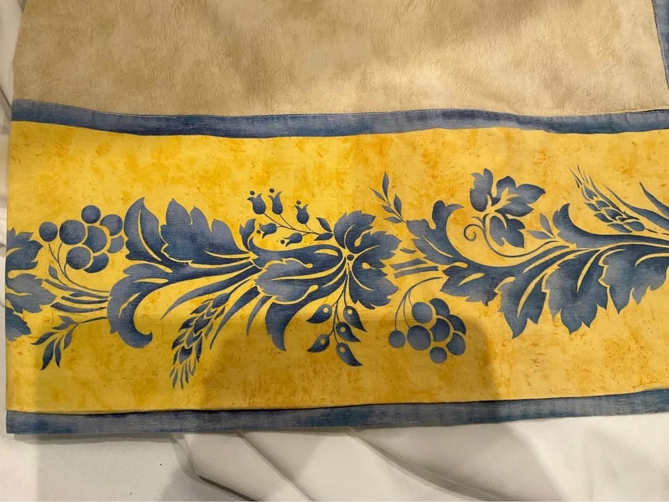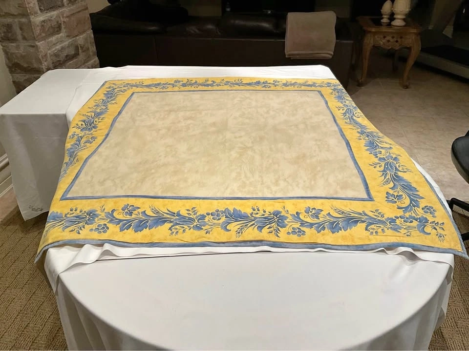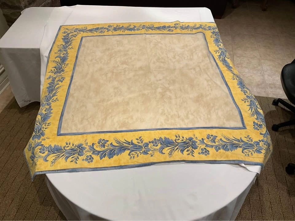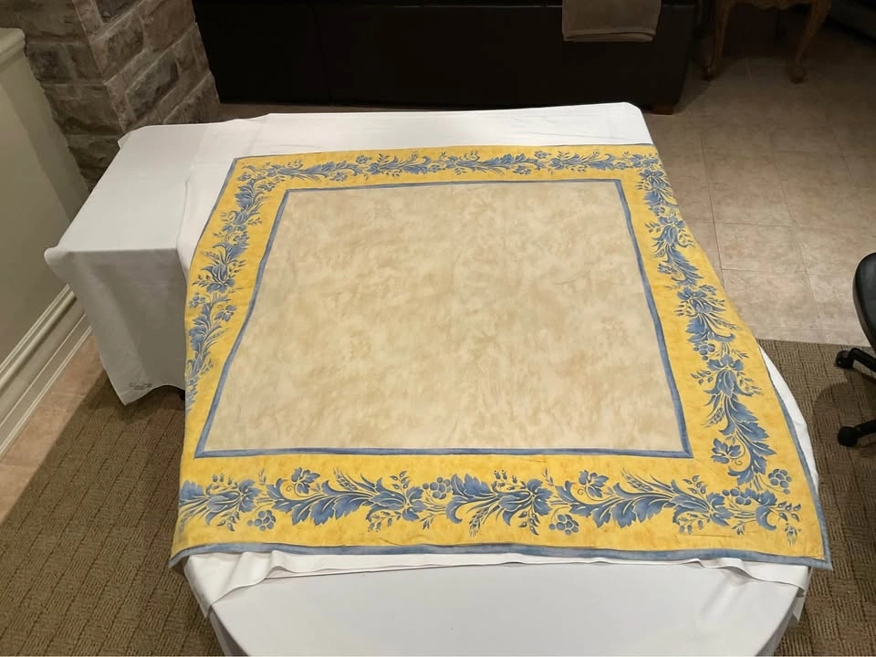Beautiful French country style Provence tablecloth. Made in France, 100% cotton. Square 58" x 58". Has a pretty yellow and blue floral design. Good Condition. Cash Only - Richmond Hill - Bathurst & King Rd.