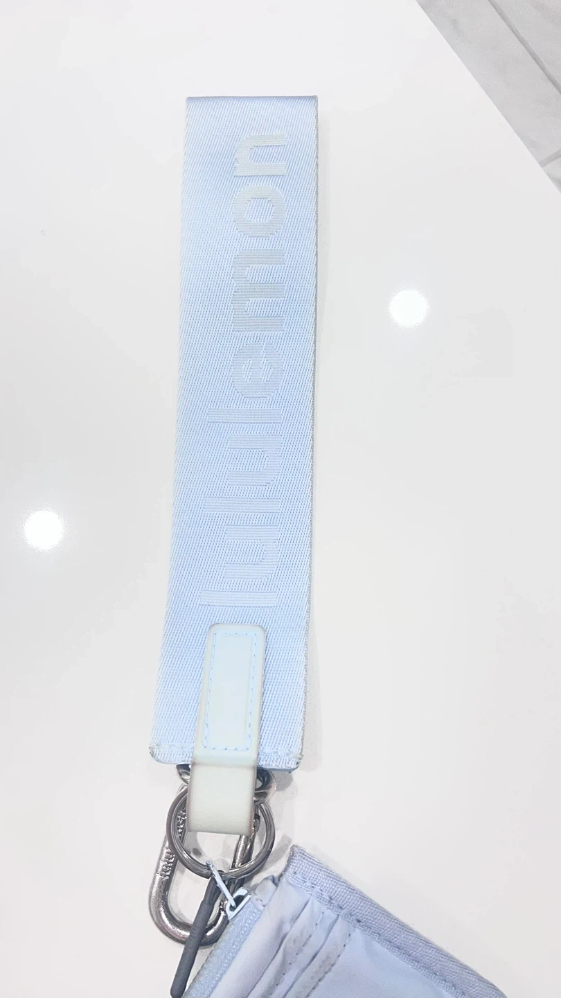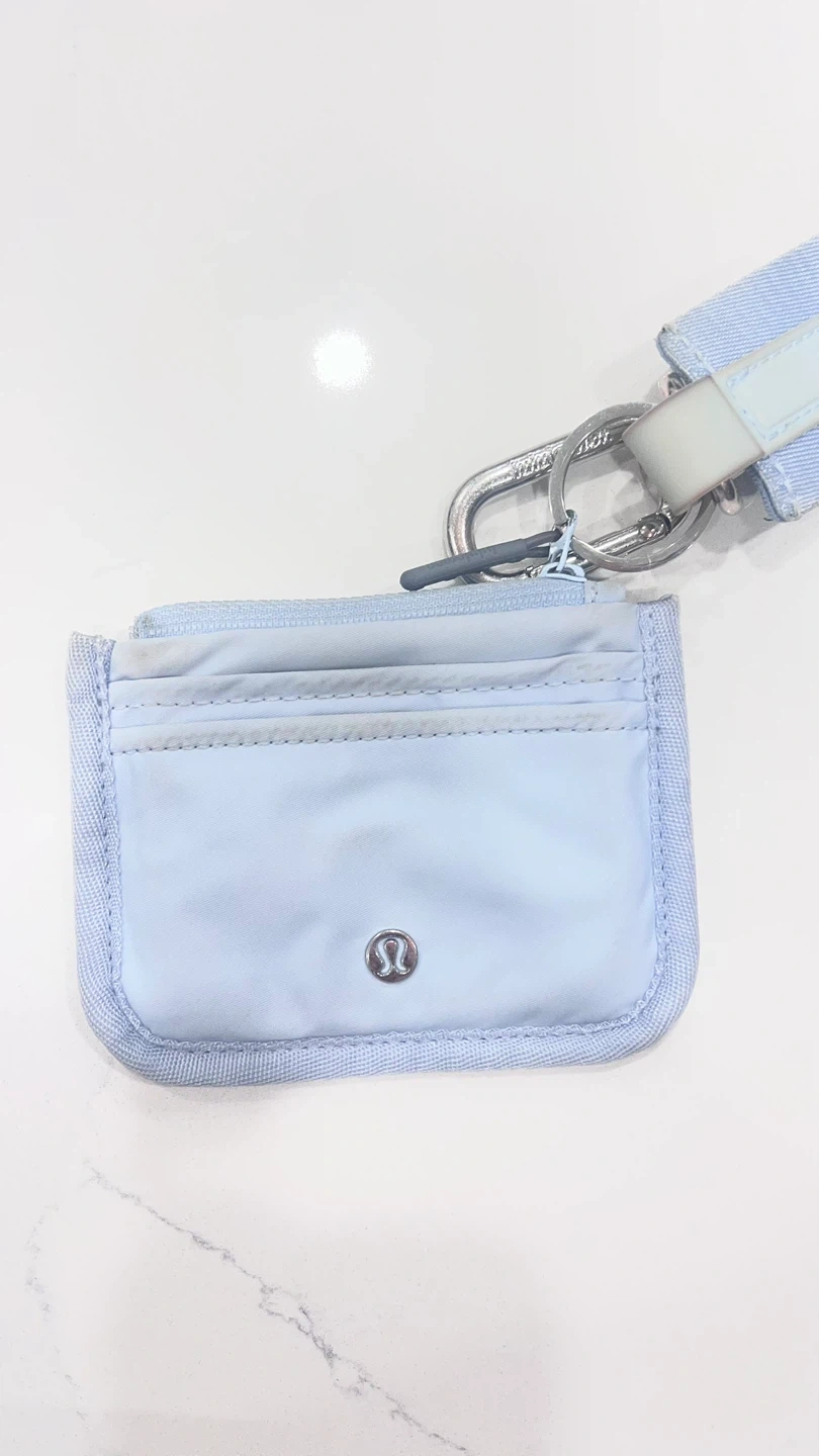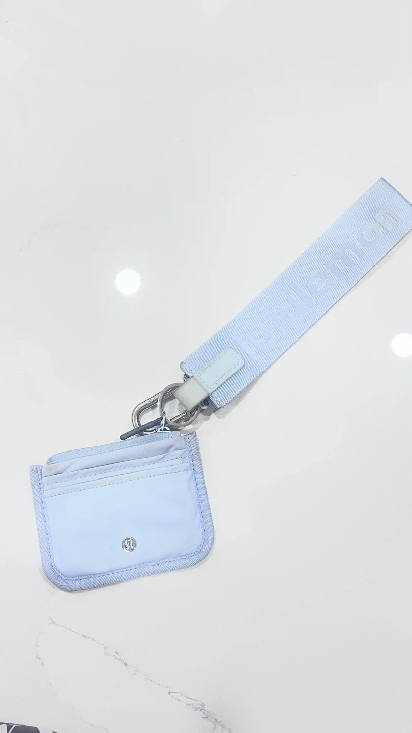 Light blue Lululemon card holder with a detachable wrist strap. Features multiple card slots and a zippered pouch