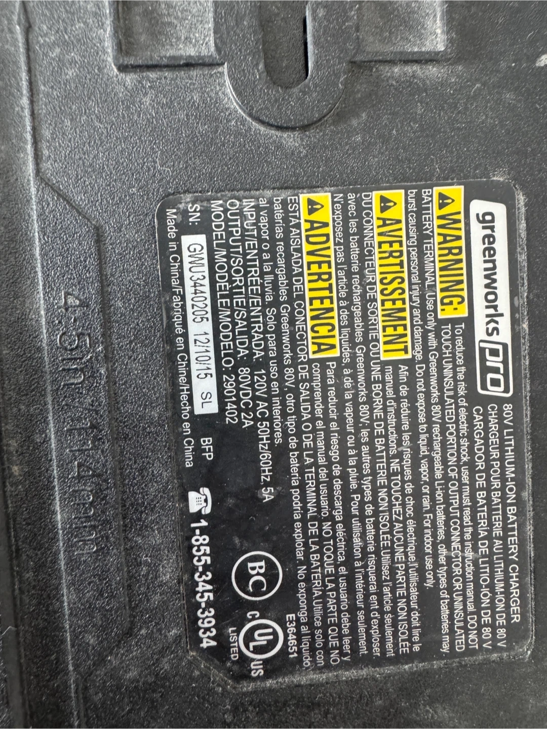 Greenworks PRO 80V Lithium-Ion battery charger. Input: 120V AC 50/60Hz, 5A. Output: 80V DC 2A. Made in China.
