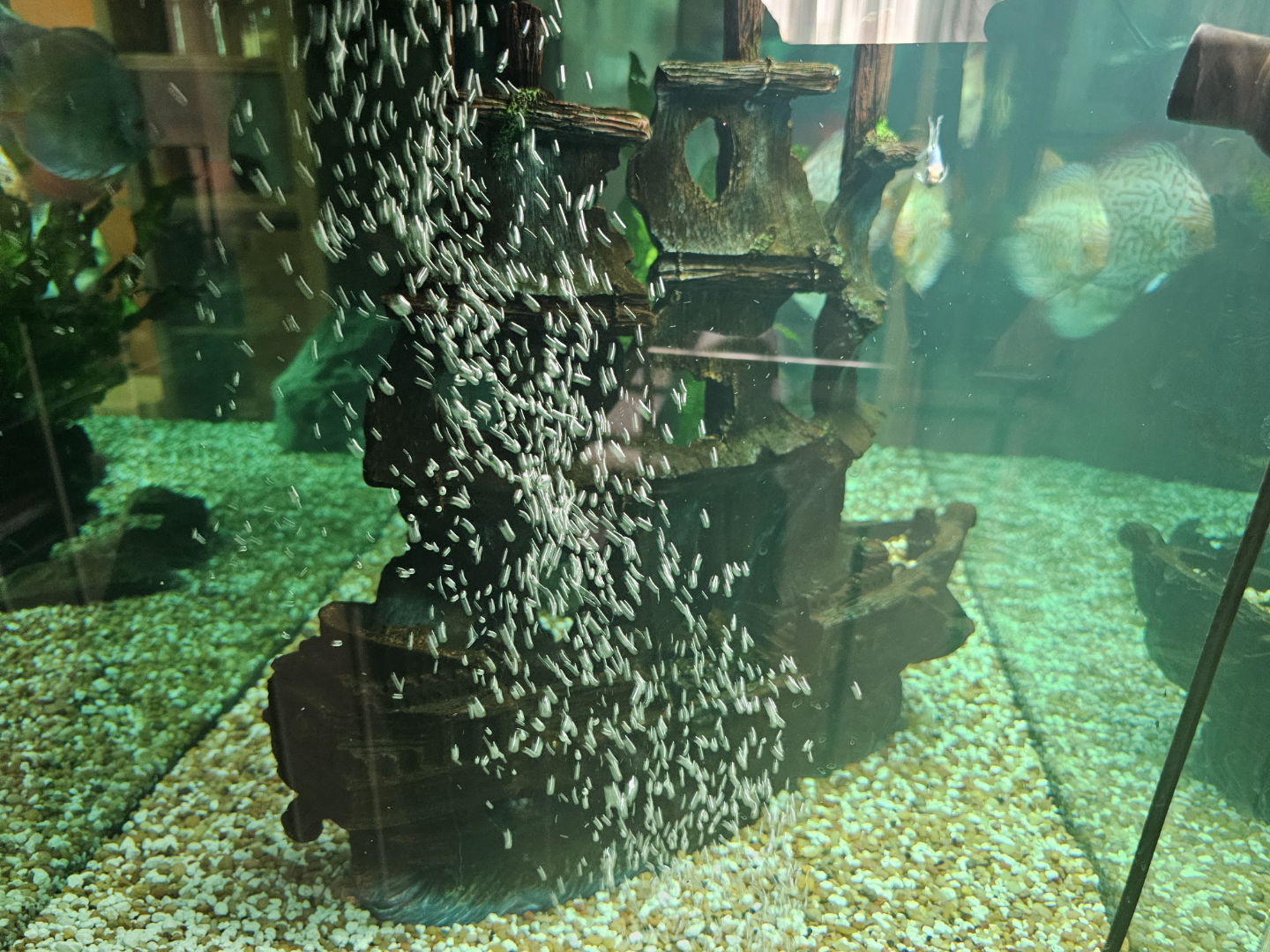 Several vibrant Discus fish, various colours. Includes established aquarium with gravel substrate, decorations, and filtration system. large ship resanable offers accepted